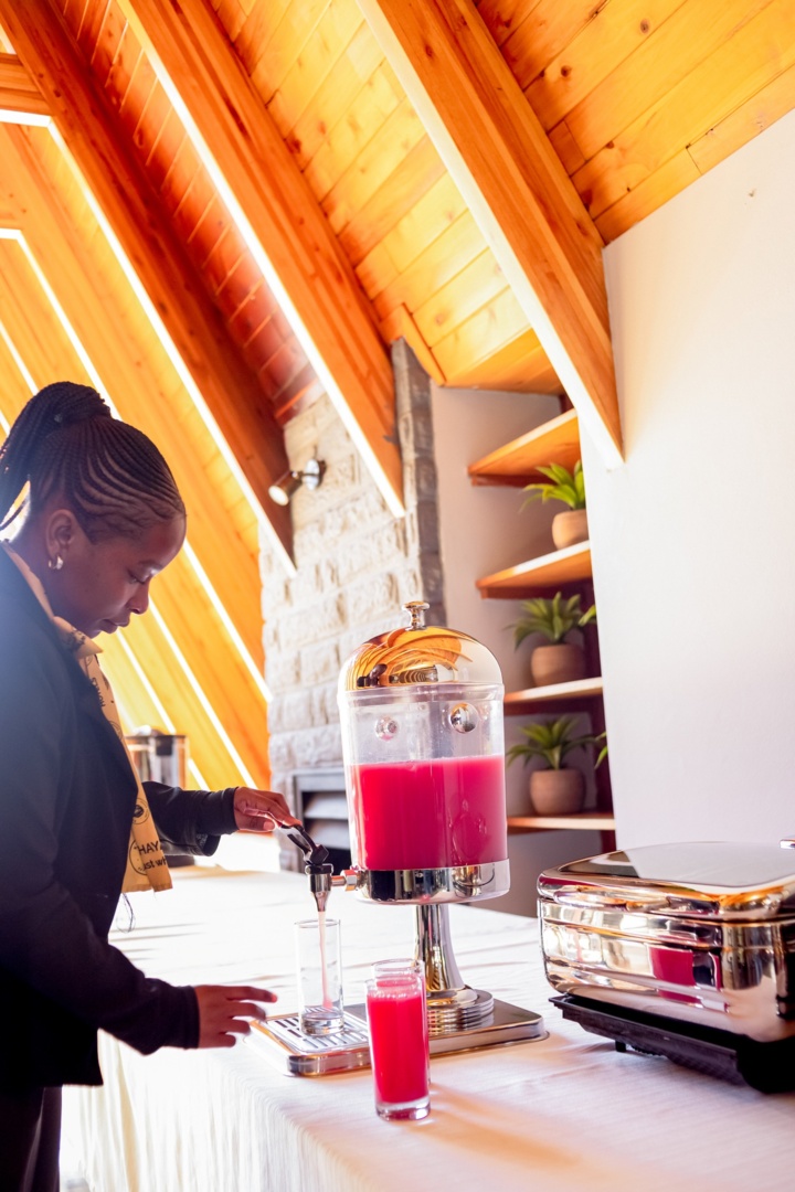 Guest in a cozy wooden lodge pouring bright pink juice from a beverage dispenser on a buffet table with plant-decor shelves nearby.