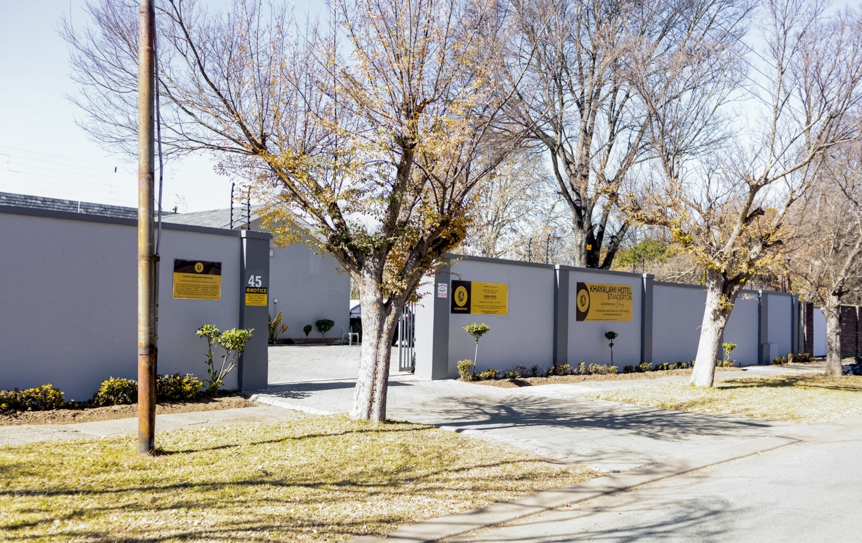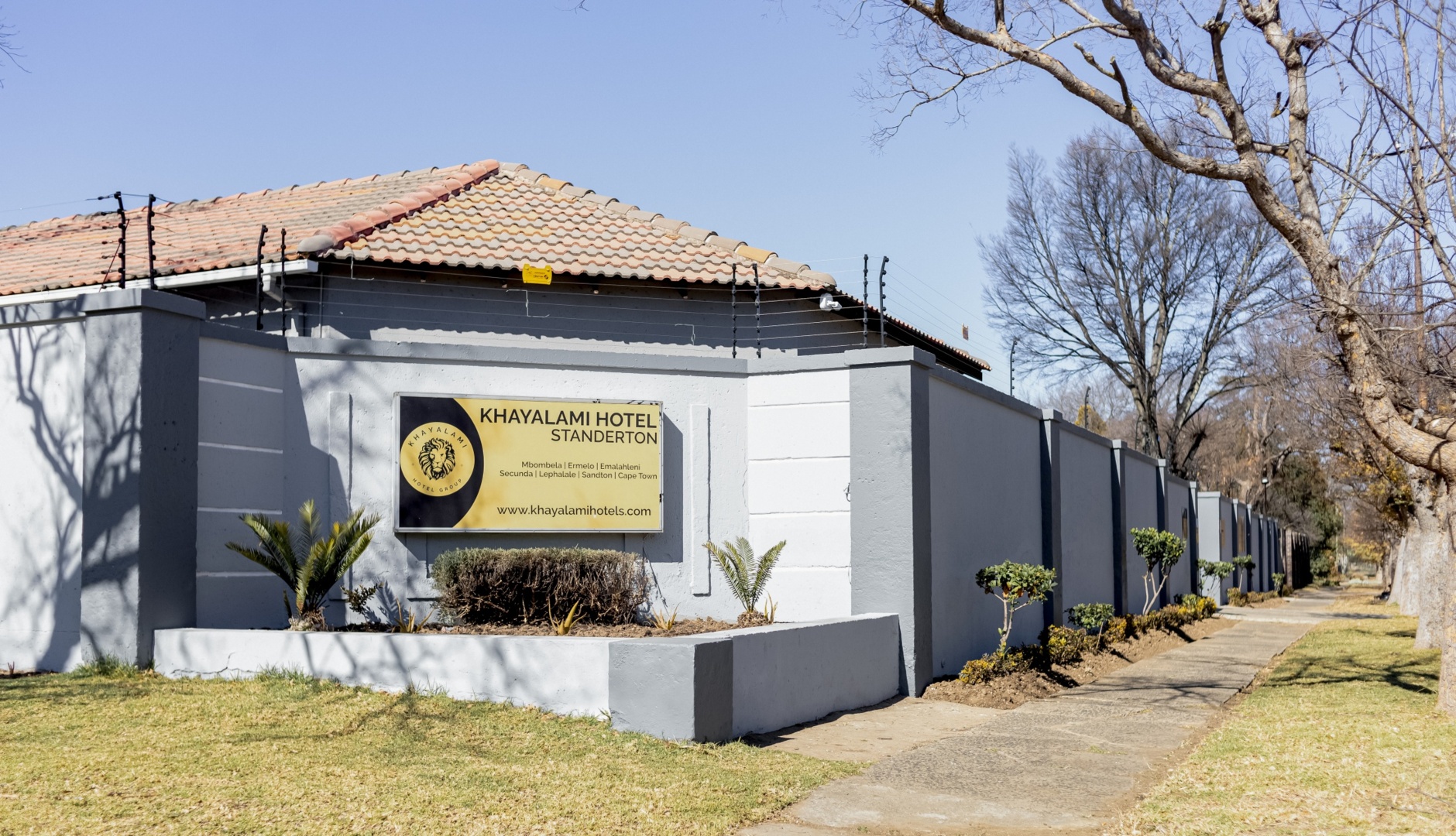 Exterior view of Khayalami Hotel in Standerton showing grey perimeter wall with yellow signage and leafless trees along the sidewalk