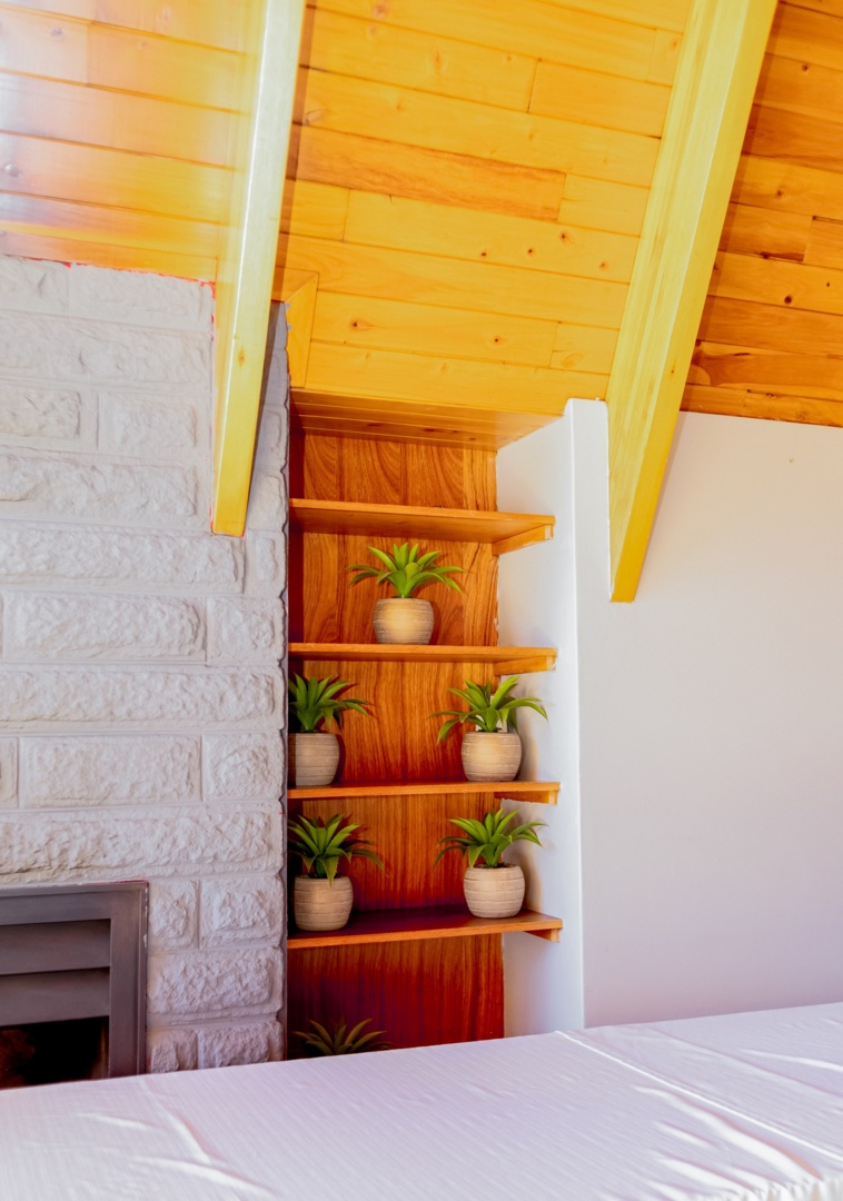 Cozy hotel room corner with light wood ceiling, stone wall, built-in shelves with potted green plants, and white bedding visible