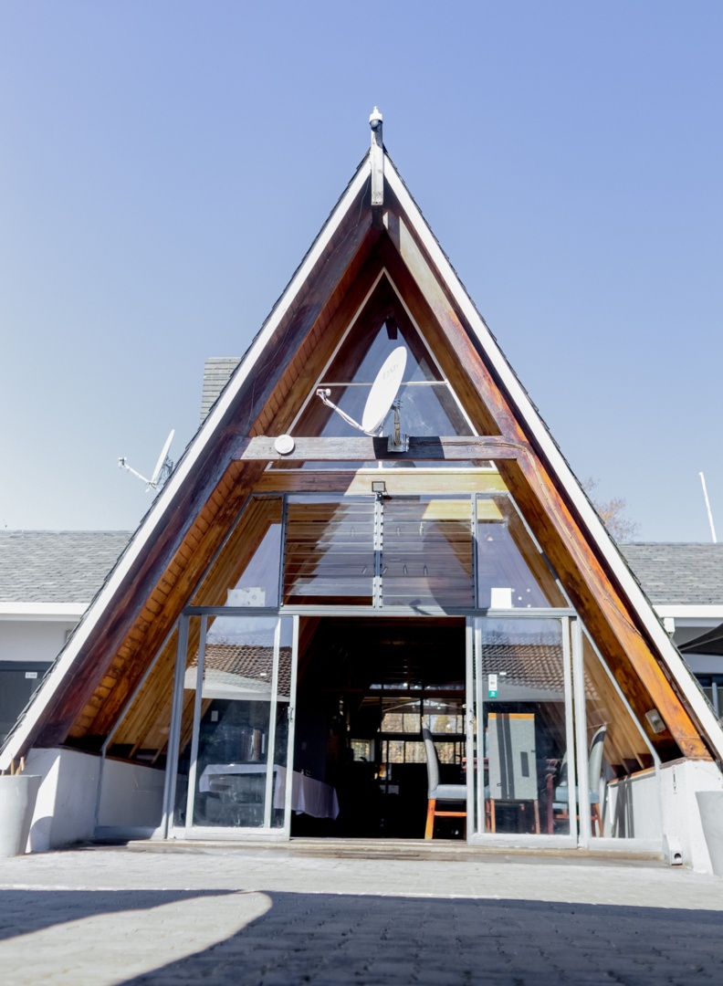 A-frame building with glass entrance, wooden beams, and outdoor seating area at a modern hotel courtyard on a clear day