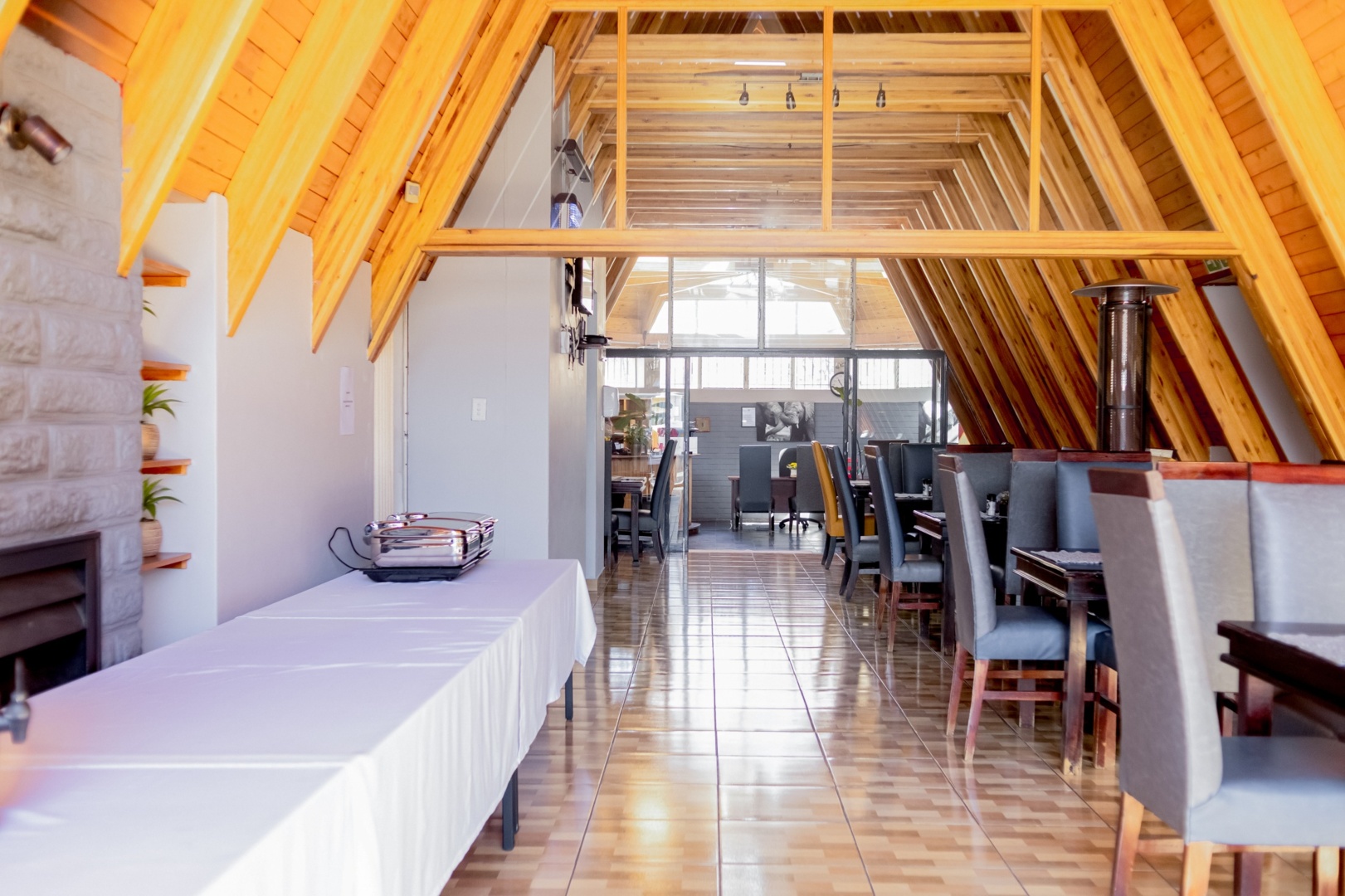 Bright dining area with slanted wooden ceiling, tiled floor, lined tables, plush chairs, and buffet setup with chafing dishes