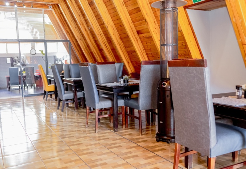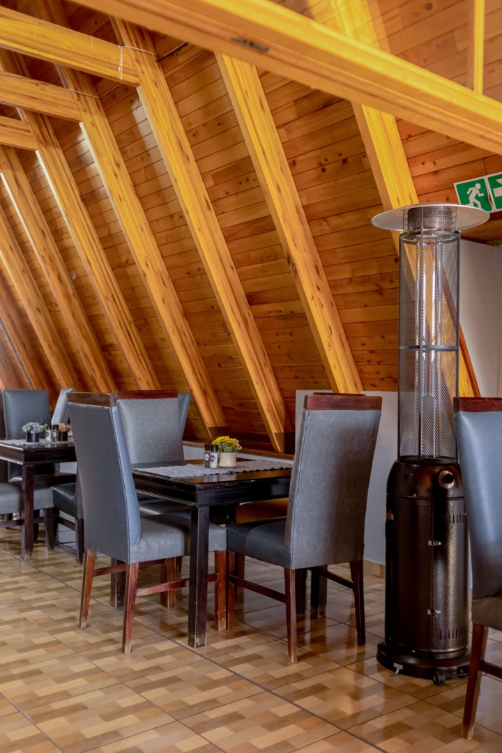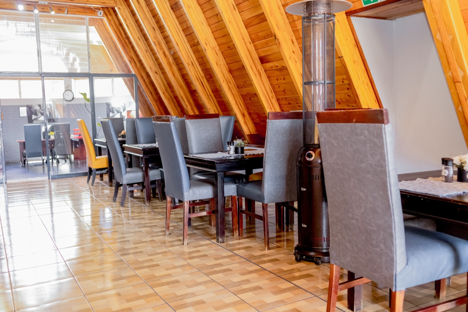 Cozy dining area with dark wood tables, gray padded chairs, wood-paneled sloped ceiling, and a standing patio heater nearby