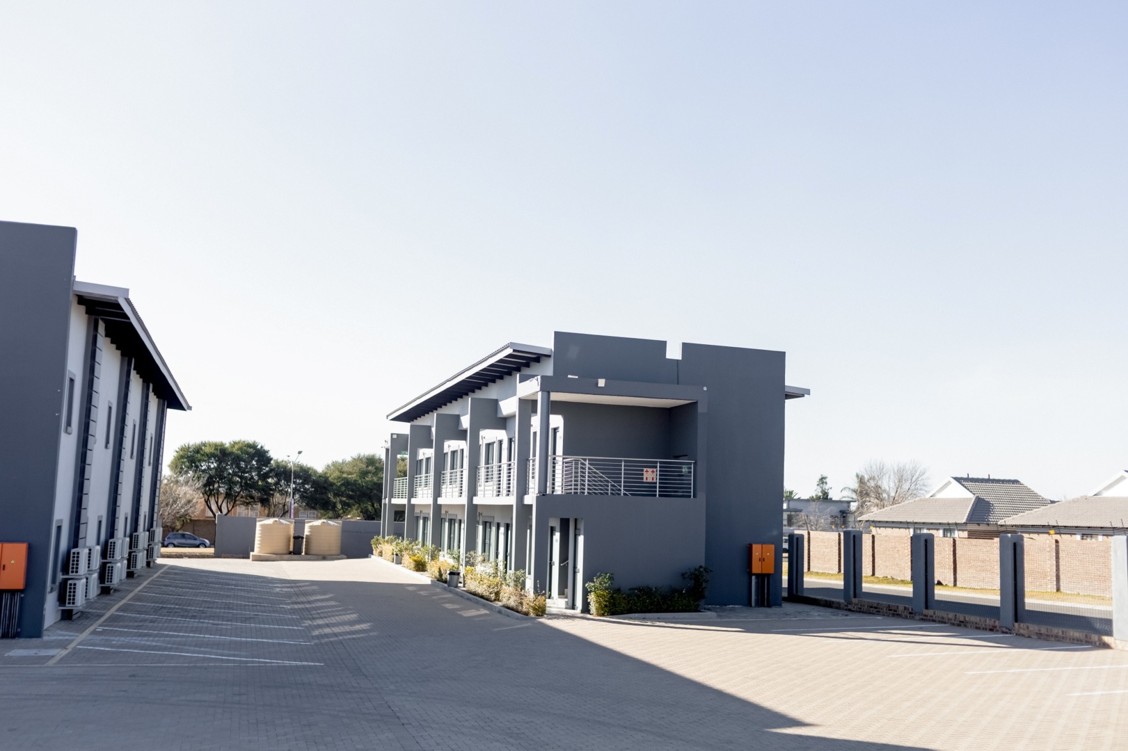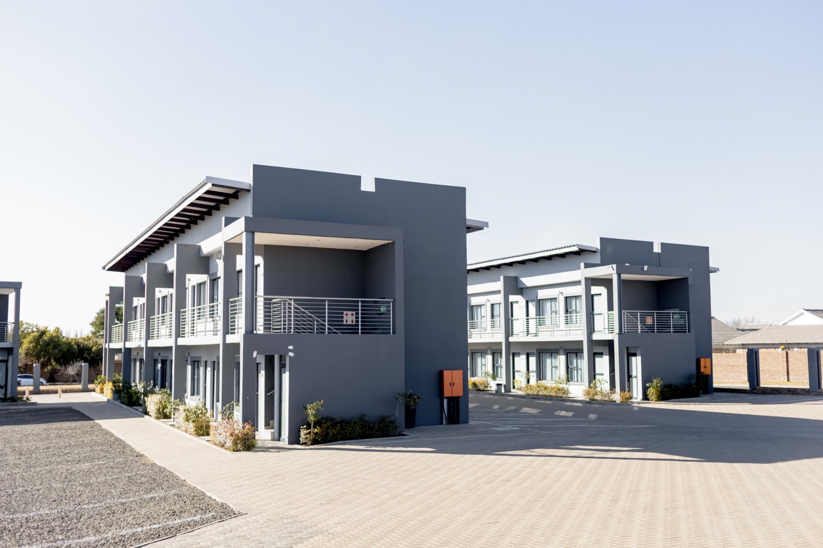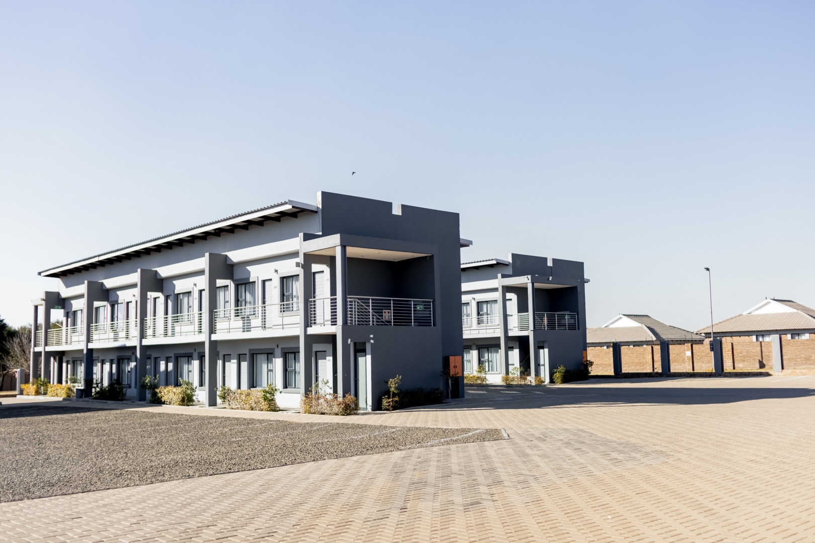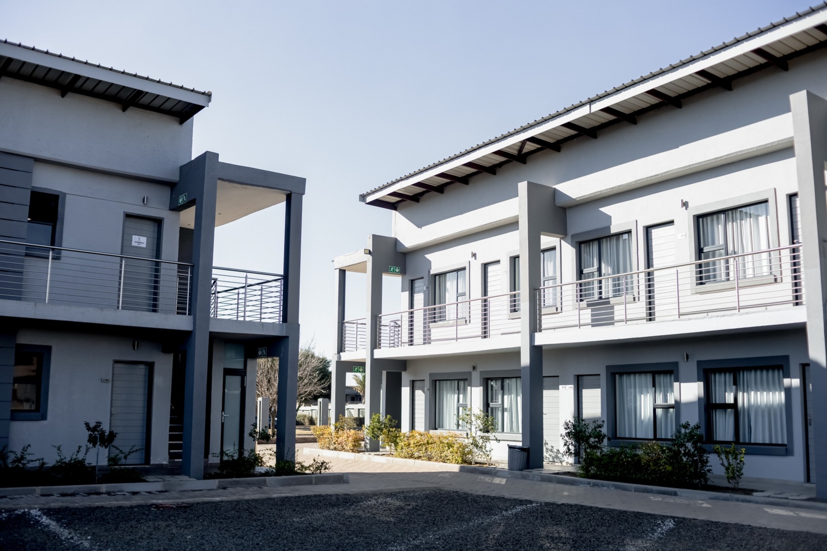 Modern two-story gray hotel buildings with balconies, surrounded by paved walkways and minimal landscaping under clear sky