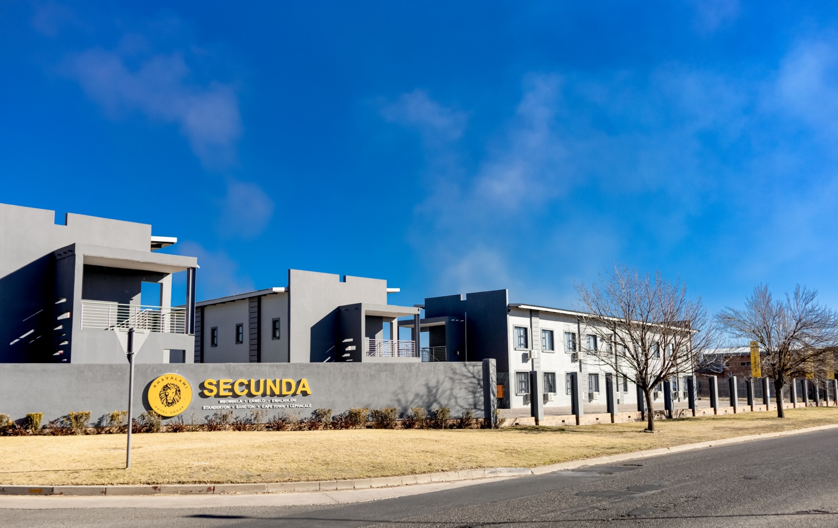 Modern hotel building with gray exterior and balconies behind a wall featuring Khayalami Hotel Group Secunda logo and signage