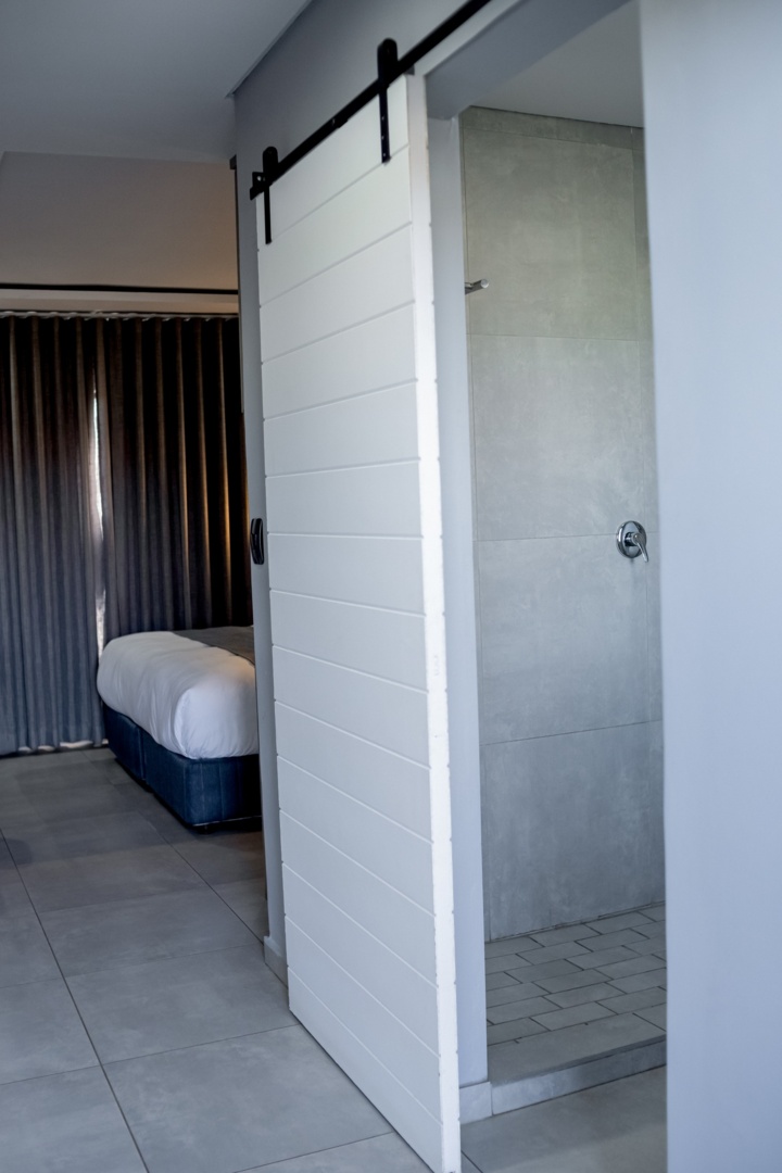 Modern hotel room with a white sliding barn door leading to a gray-tiled shower, bed with white linens, and dark curtains.