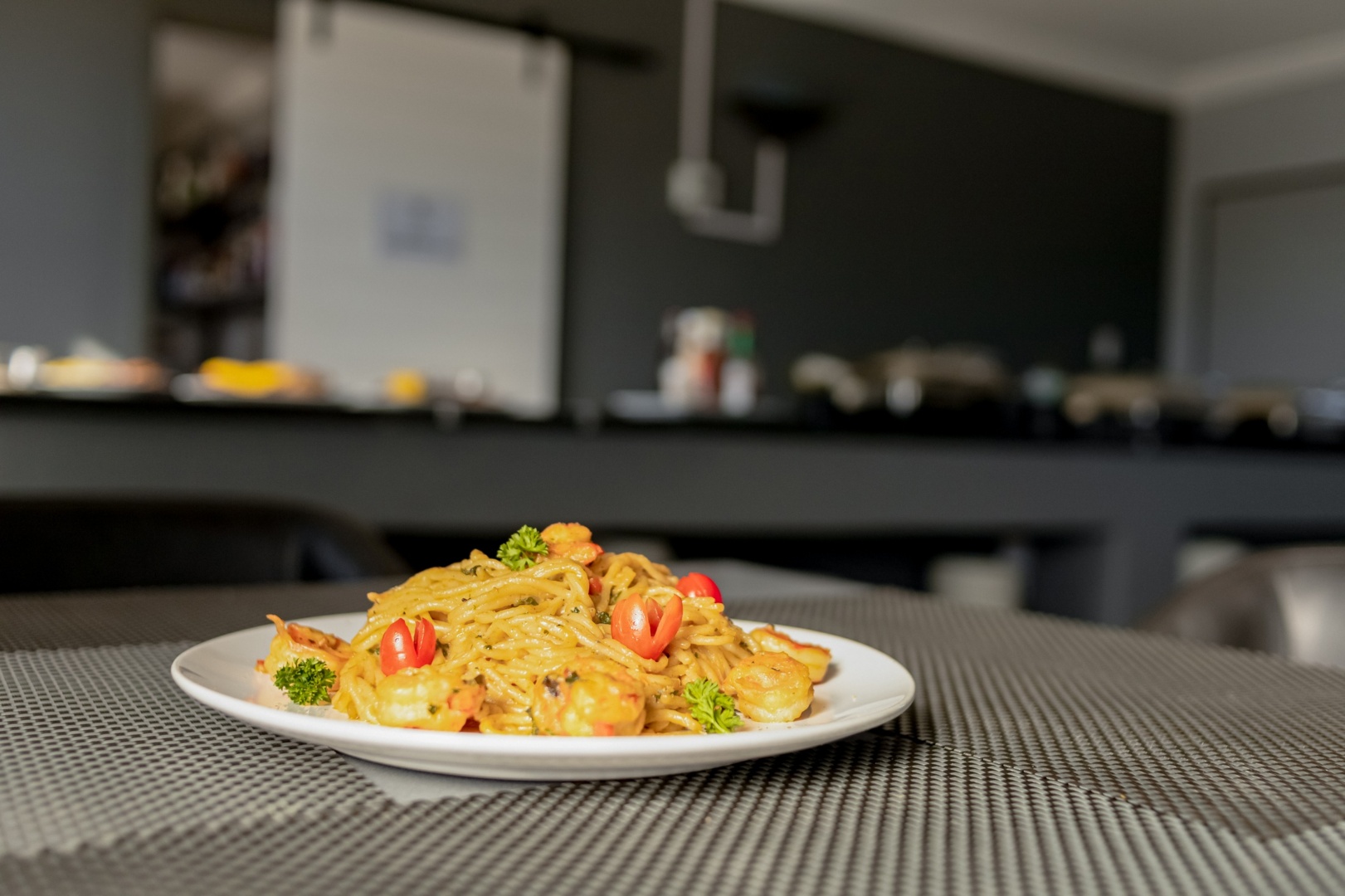 Plate of shrimp pasta garnished with parsley and cherry tomatoes on a gray mesh table in a modern dining area