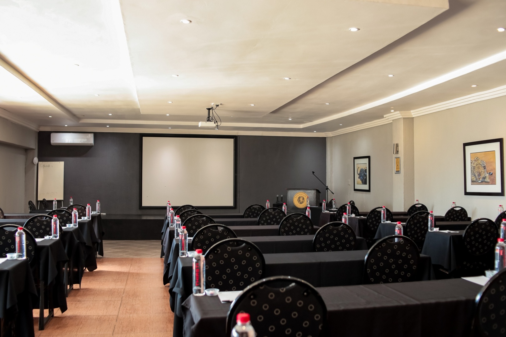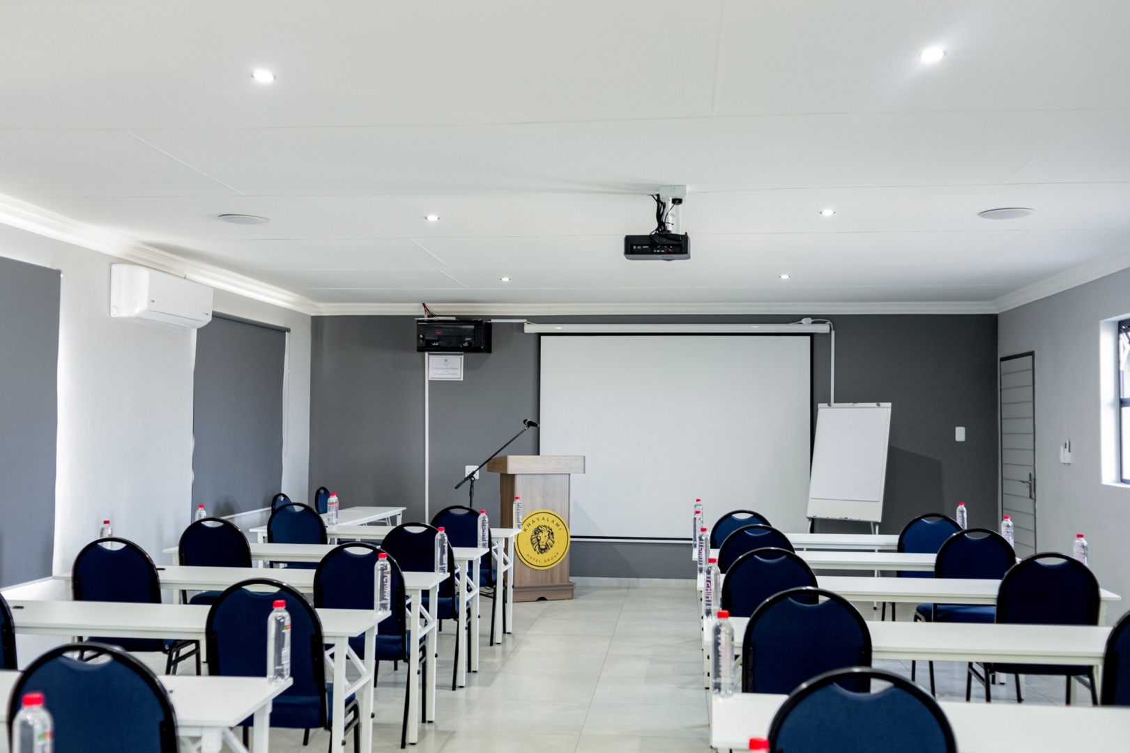 Conference room with wooden podium, branded with lion logo, water bottles on tables, and white projection screen on gray wall