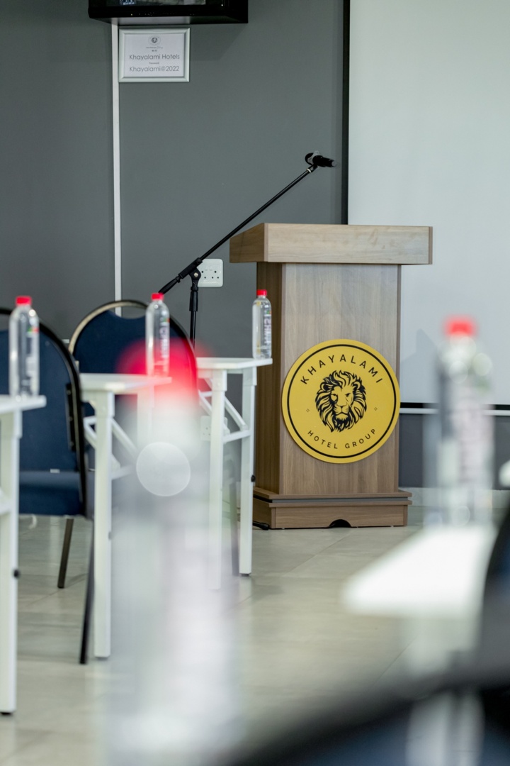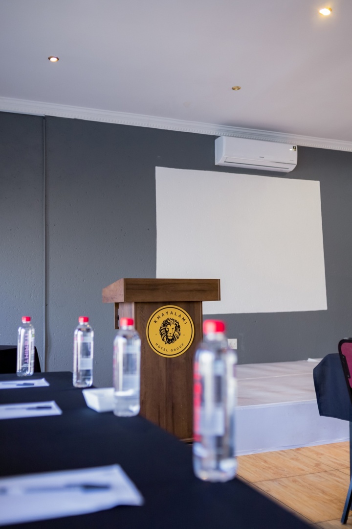 Conference room setup with wooden podium featuring Khayalami Hotel Group logo and microphone, surrounded by chairs and water bottles.