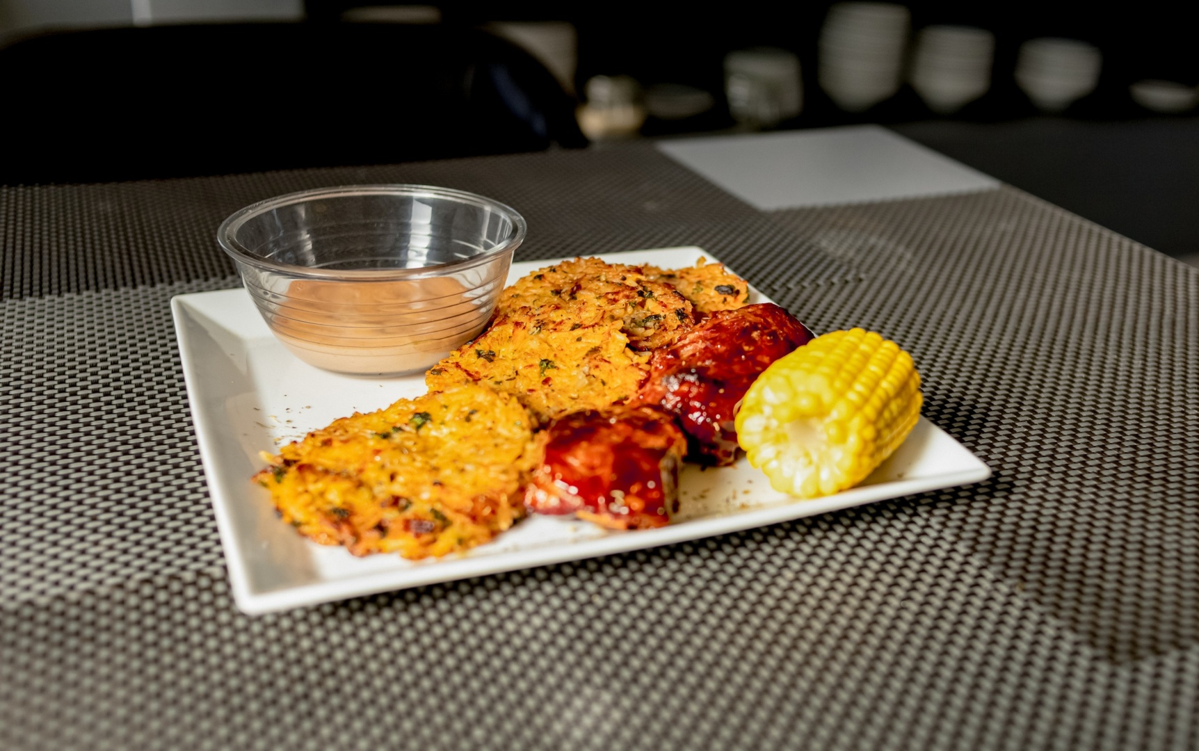 Crispy corn fritters with barbecue-glazed ribs, corn on the cob, and a creamy dipping sauce on a white plate