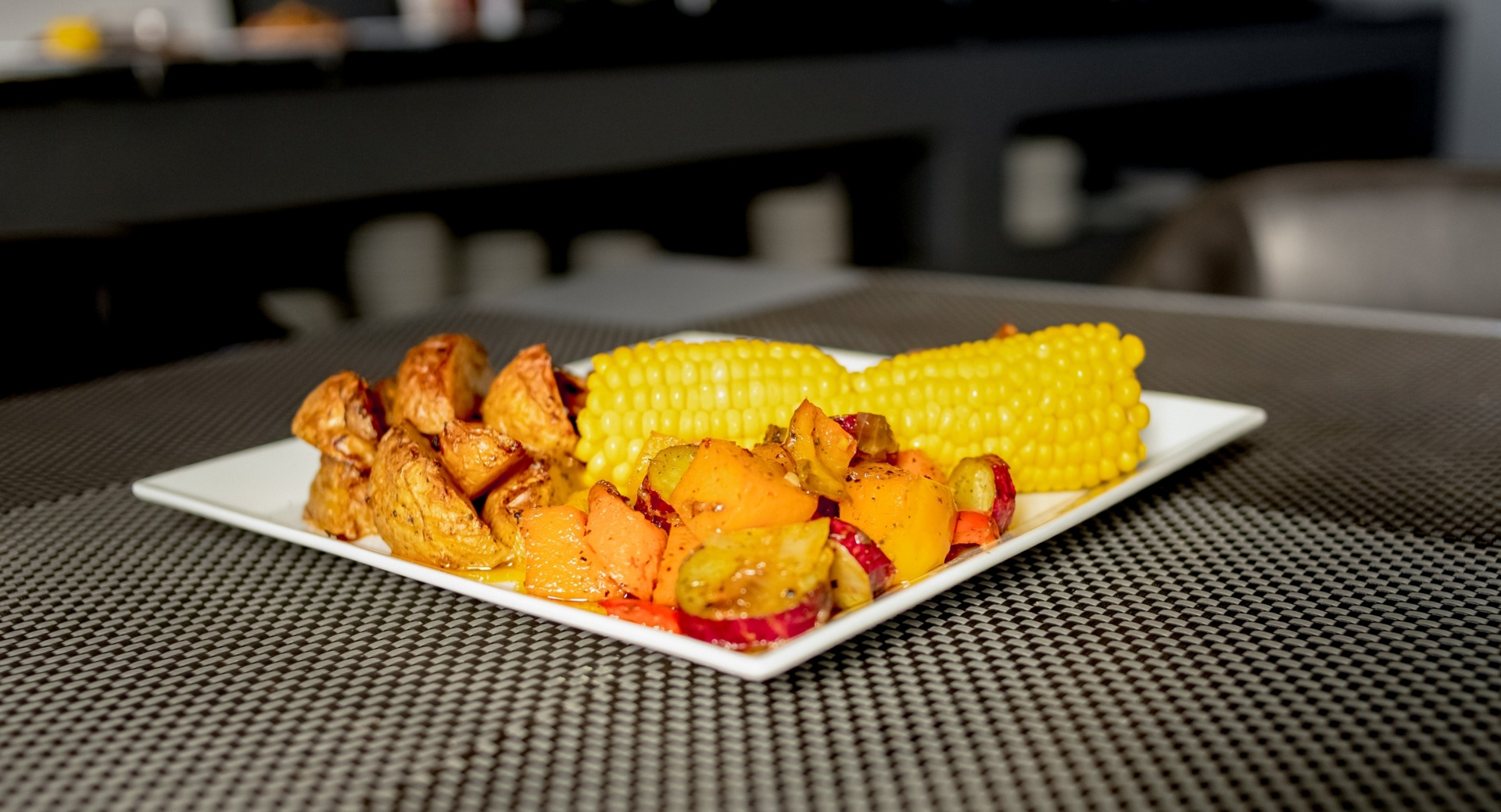 Square white plate with roasted potato wedges, seasoned mixed vegetables, and two bright yellow corn on the cob pieces on a textured table