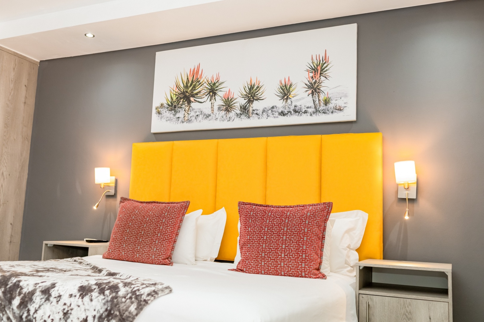 Modern hotel room with bright yellow padded headboard, twin red patterned pillows, soft lighting, and botanical artwork above the bed