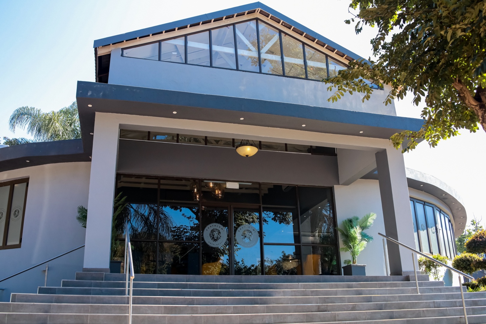 Modern hotel entrance with large glass doors, high windows, wide staircase, and potted plants under a clear blue sky