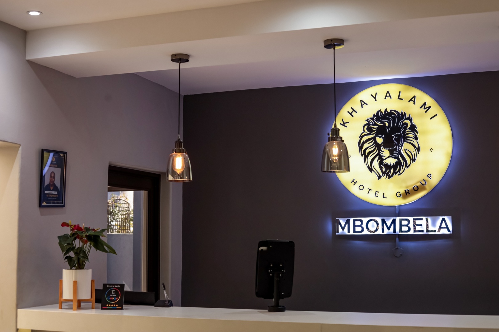 Modern hotel reception with illuminated Khayalami Hotel Group Mbombela sign, pendant lights, and a small plant on white front desk