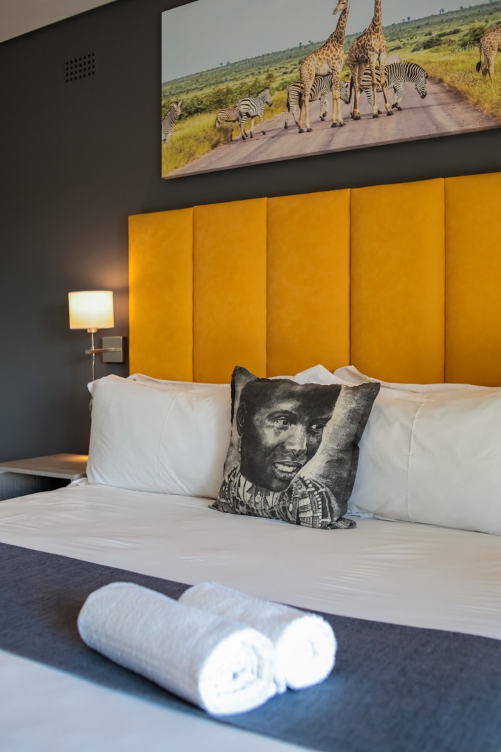 Modern hotel room with a yellow padded headboard, white linens, a decorative pillow with an artistic face, and safari-themed wall art above the bed