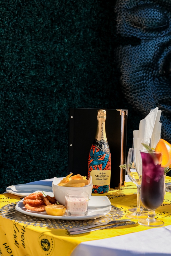 Table set with a colorful bottle of Simonsig wine, a bowl of fries, fried calamari, dipping sauce, and a purple cocktail garnished with an orange slice
