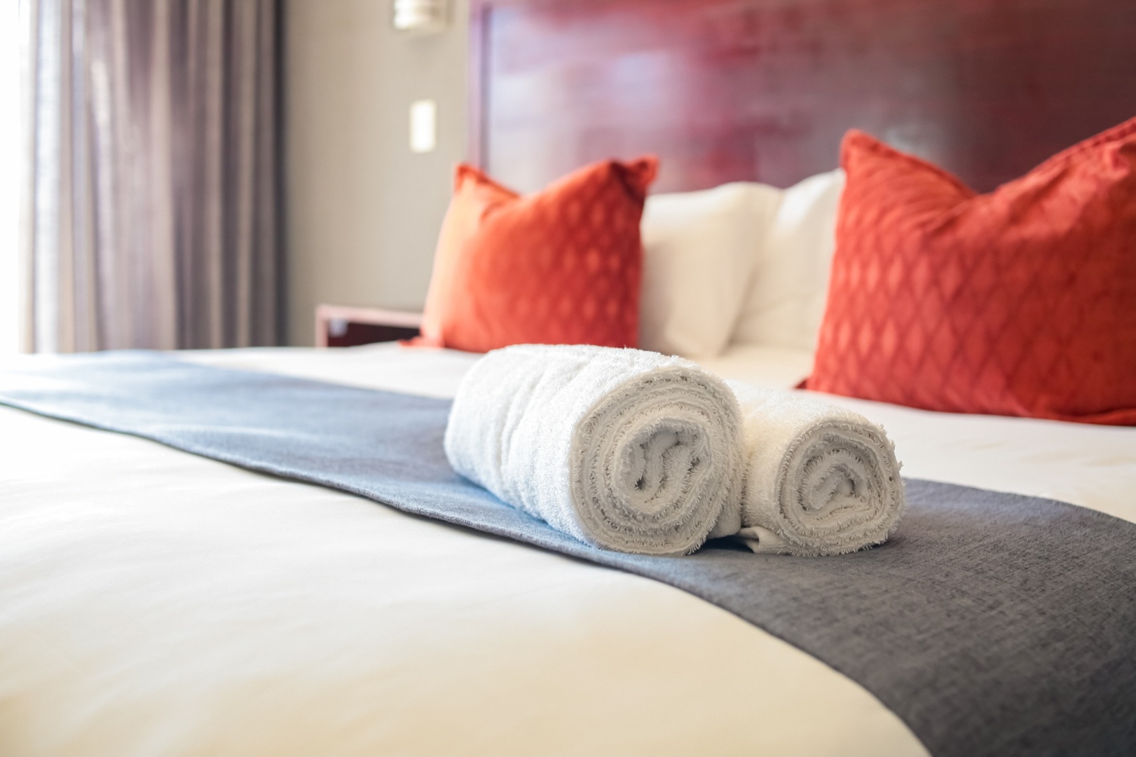 Hotel bed with crisp white linens, folded white towels on a blue runner, and vibrant orange accent pillows