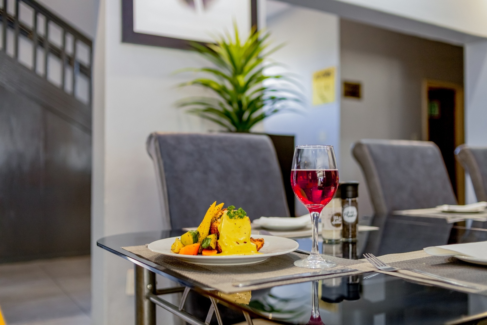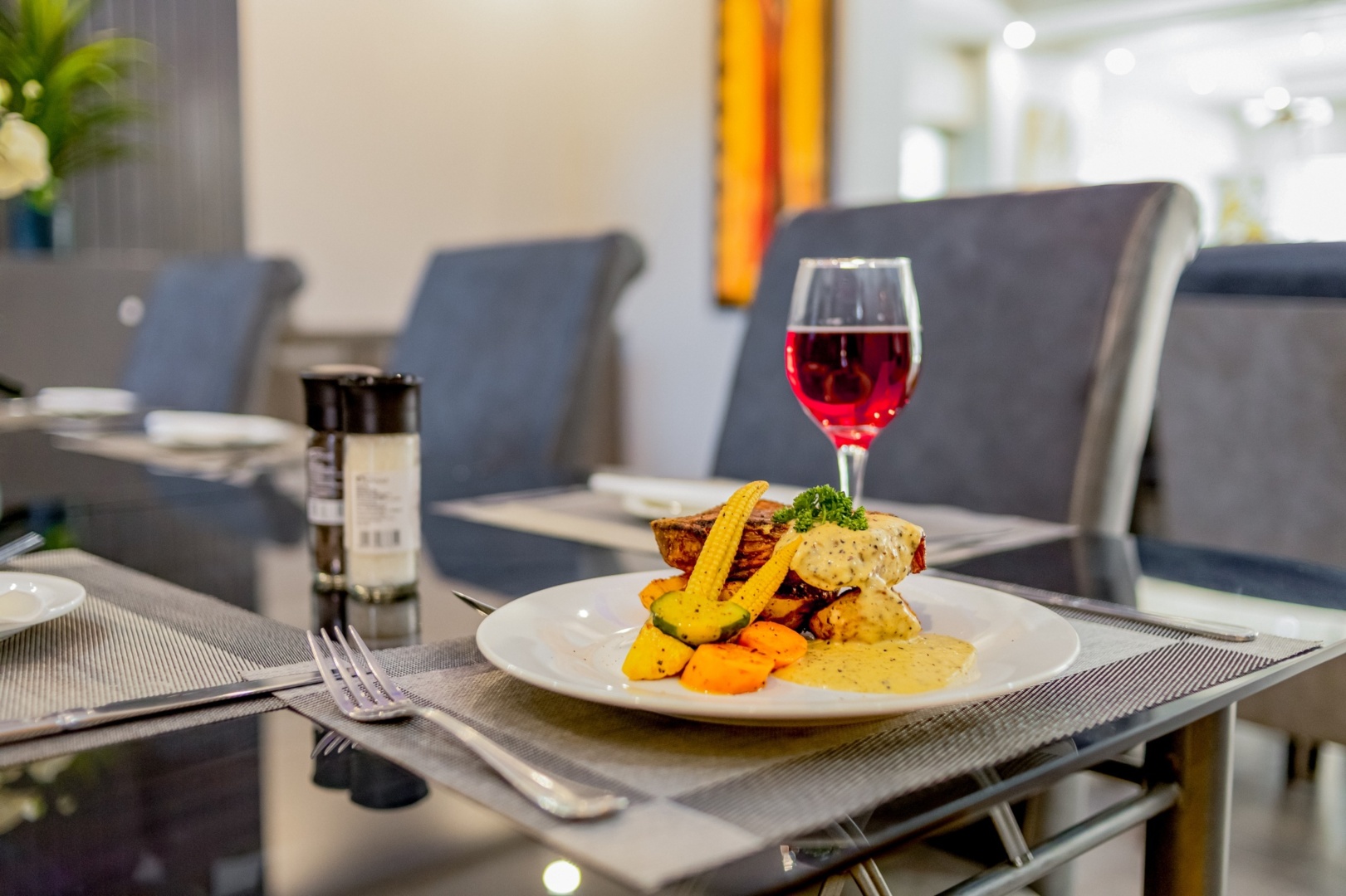 Grilled steak with creamy sauce, roasted vegetables, and a glass of red wine on a sleek dining table in a modern hotel restaurant