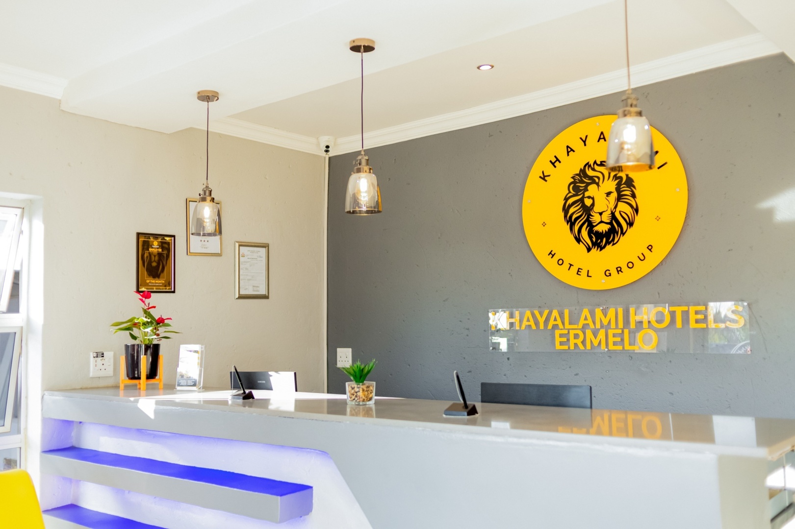 Bright hotel reception with modern gray desk, illuminated blue shelves, pendant lights, and Khayalami Hotels Ermelo logo on the wall