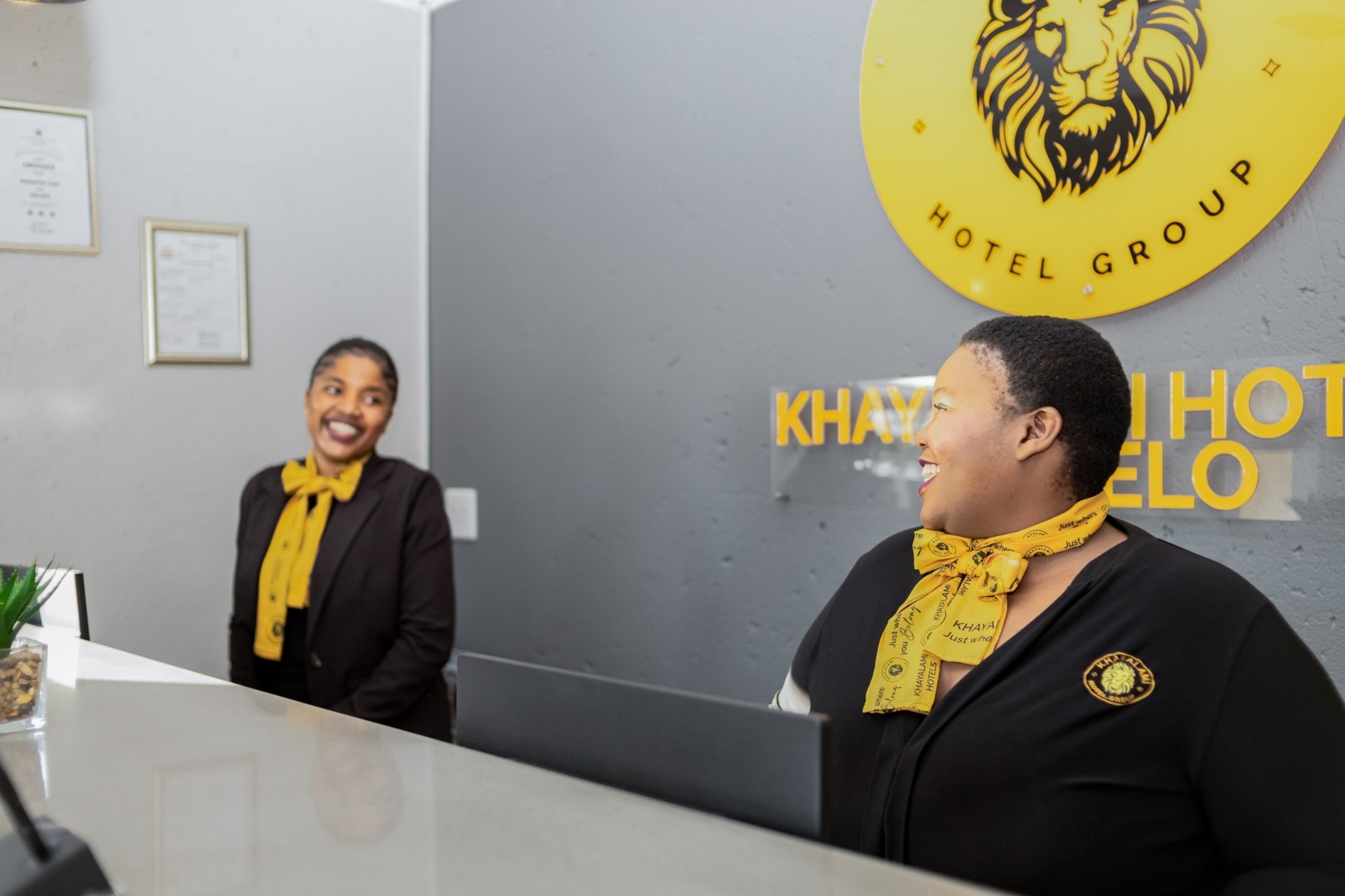 Two smiling hotel receptionists wearing black uniforms and yellow scarves at a modern front desk with a lion logo on the wall