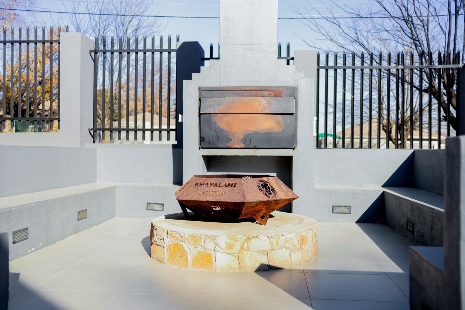 Outdoor fire pit with rusted metal bowl engraved Khayalami Ermelo, surrounded by stone base and concrete bench seating under clear sky