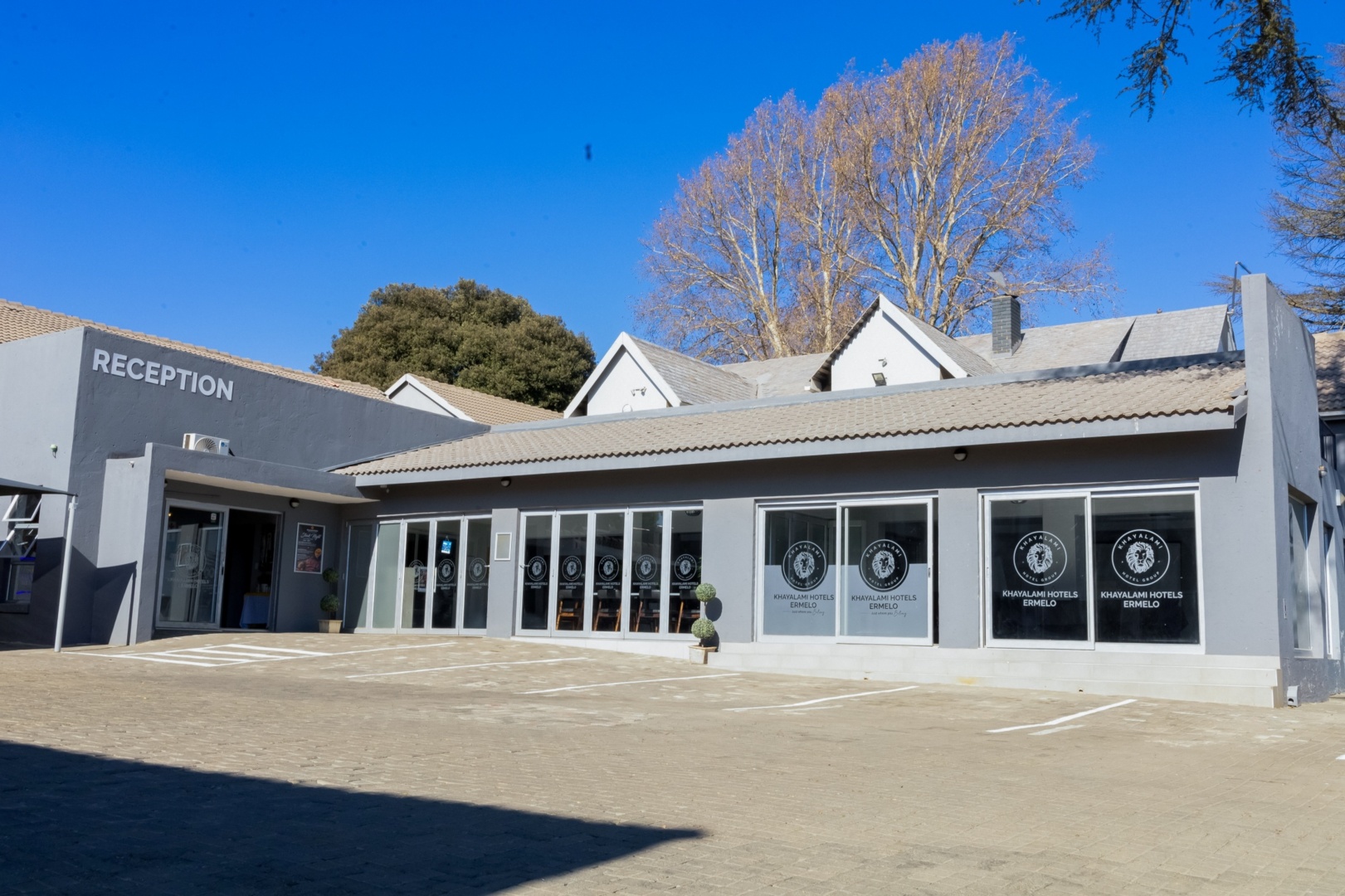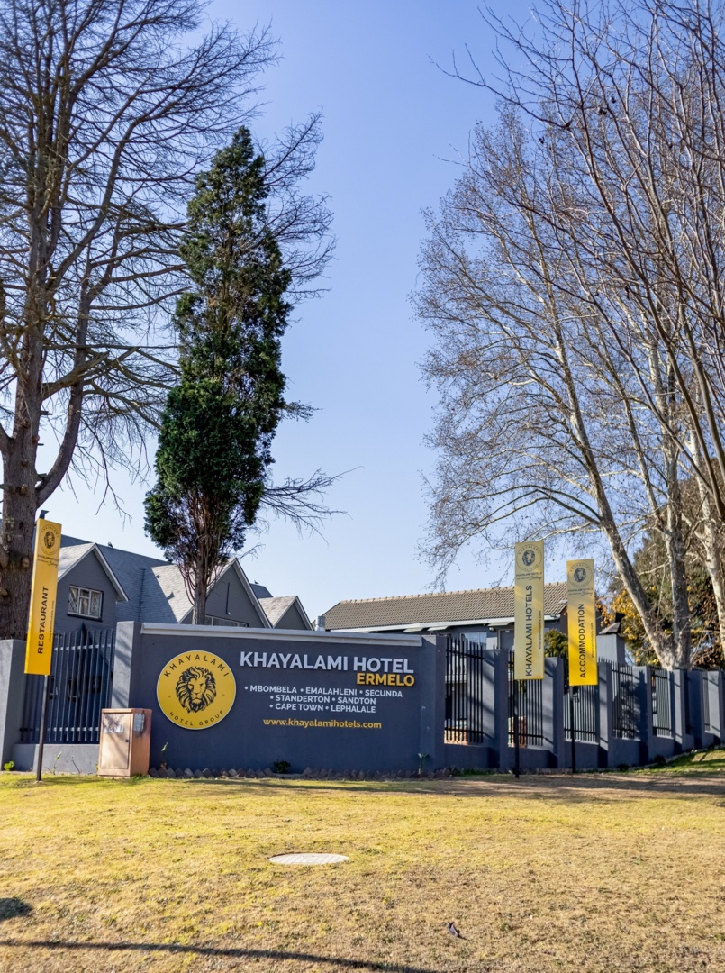 Exterior view of Khayalami Hotel Ermelo with clear signage, tall trees, and a calm, sunny atmosphere inviting guests.