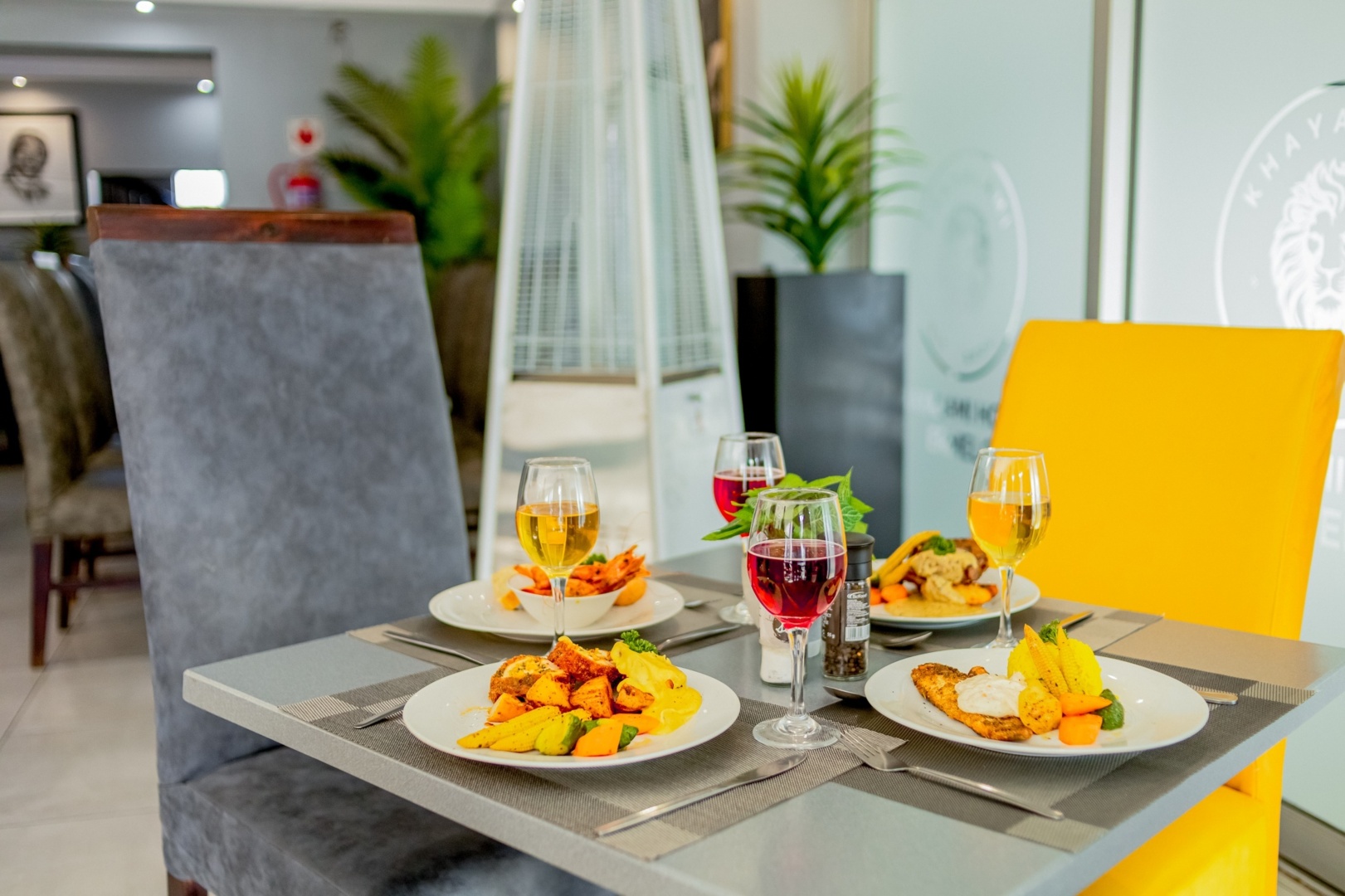 Modern dining table set with plated gourmet meals, assorted wines, and colorful upholstered chairs in bright restaurant ambiance