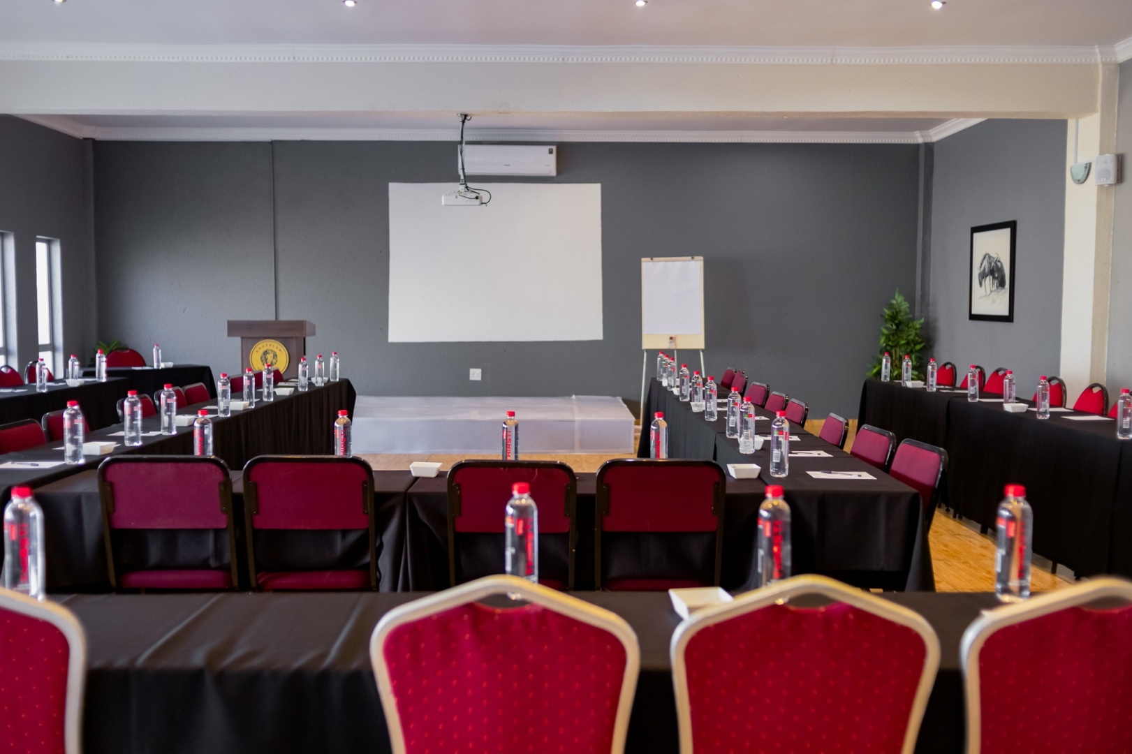 Conference room with U-shaped black tables, red chairs, water bottles, projector screen, podium, and flip chart for meetings or events