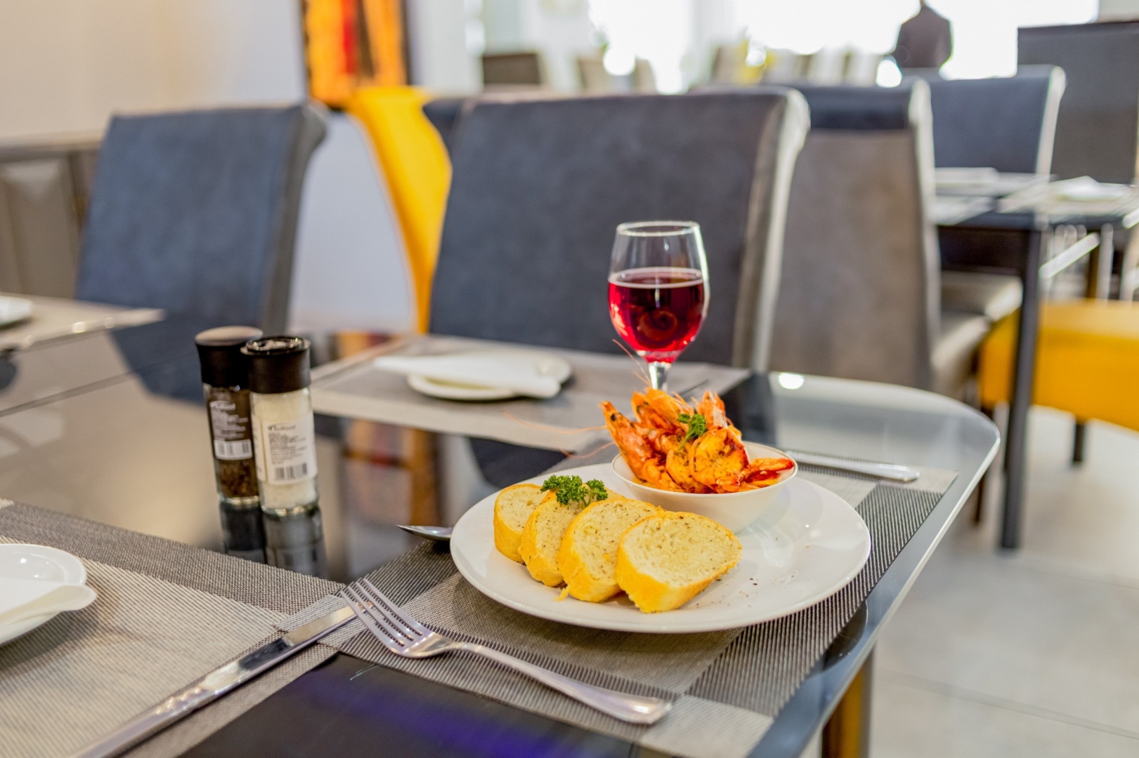 Glass of red wine paired with grilled shrimp and sliced baguette on a modern restaurant table with gray and yellow chairs