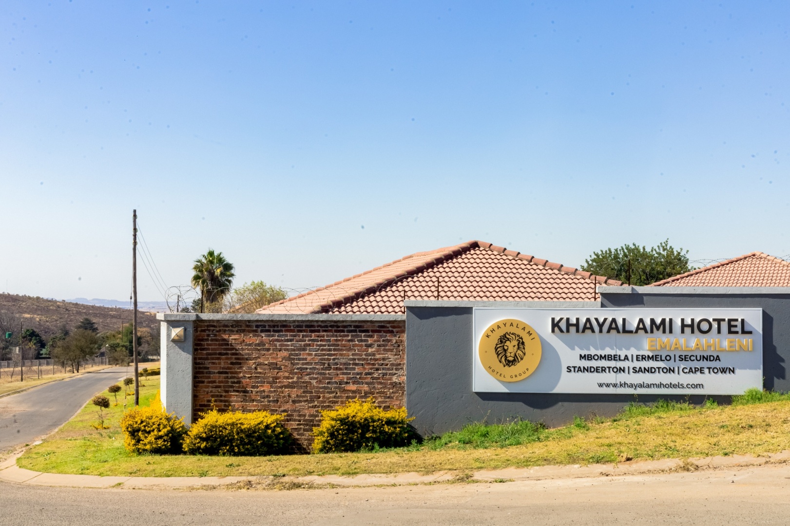 Khayalami Hotel Emalahleni entrance with brick and gray wall, terracotta roof tiles, and landscaped yellow bushes under clear blue sky