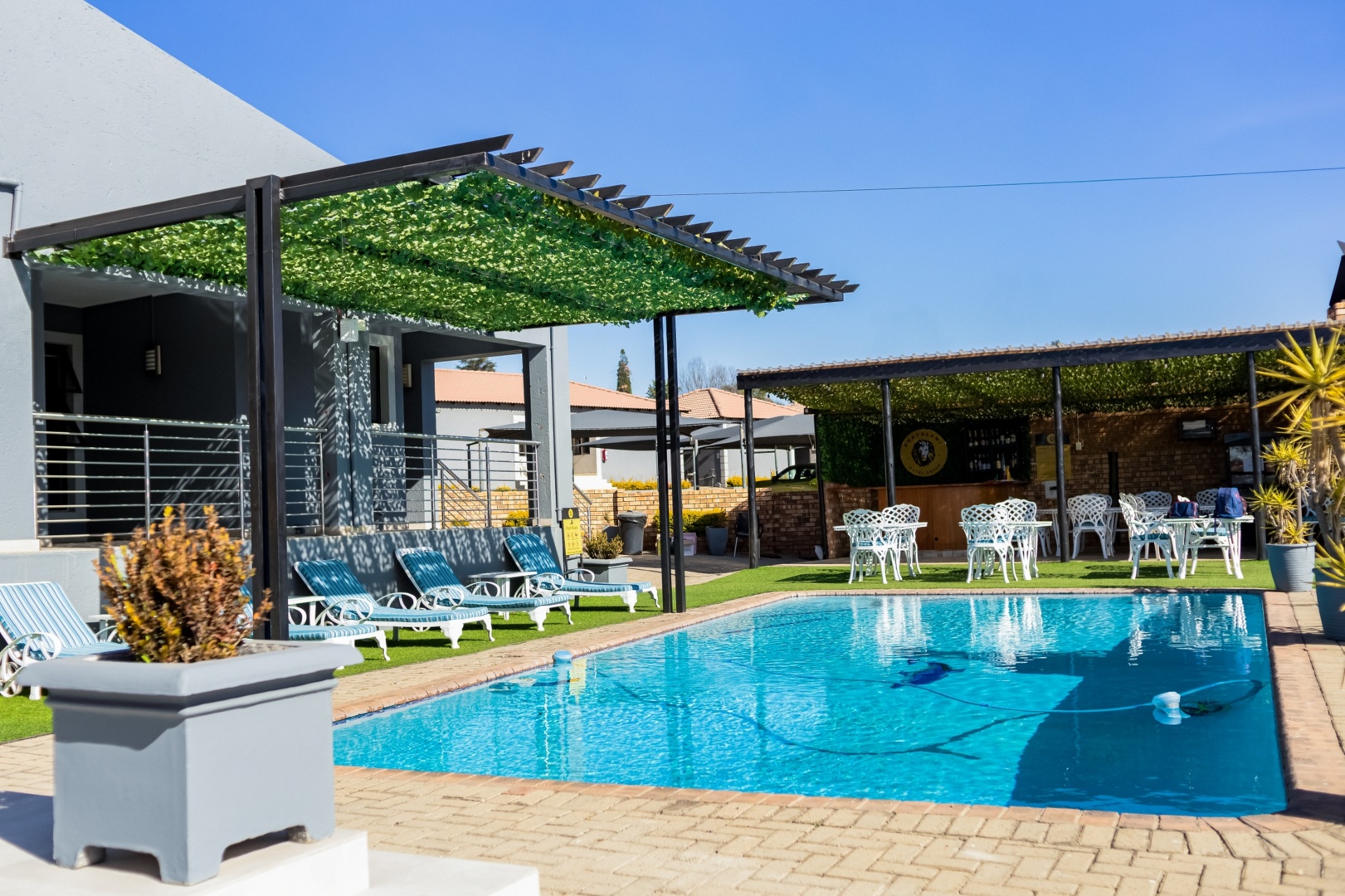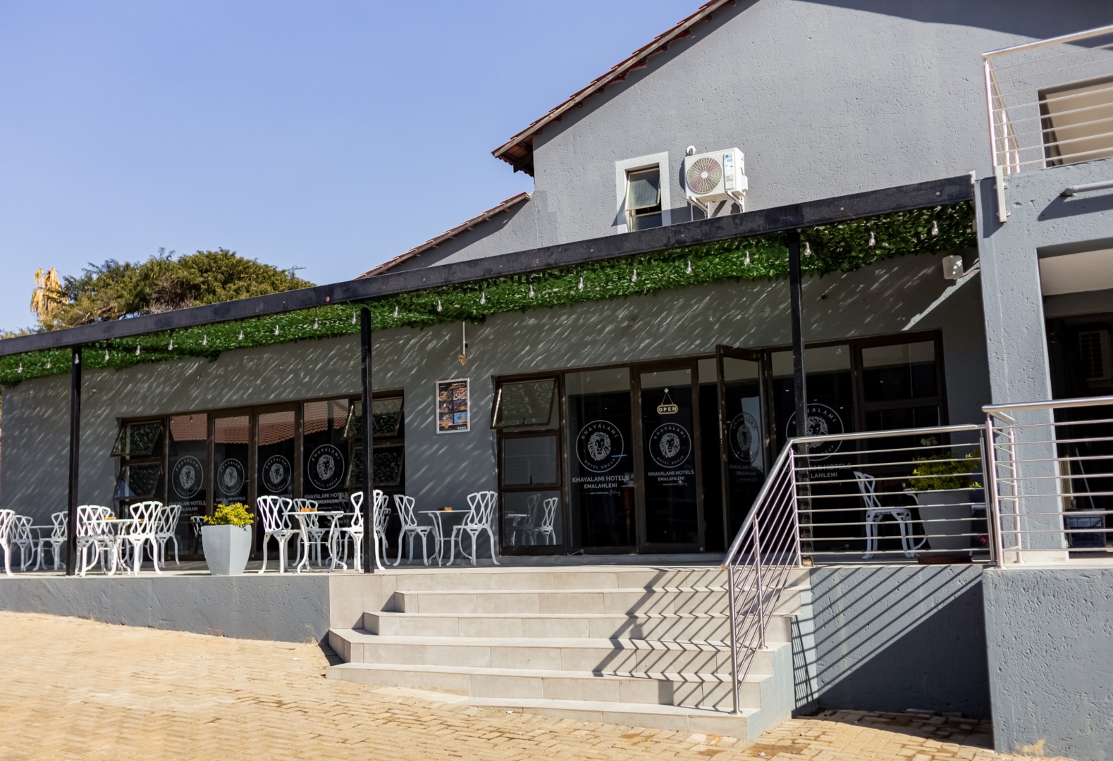 Khayalami Hotel Standerton exterior with a tiled roof, gated gray wall, landscaped plants, and a clear blue sky above