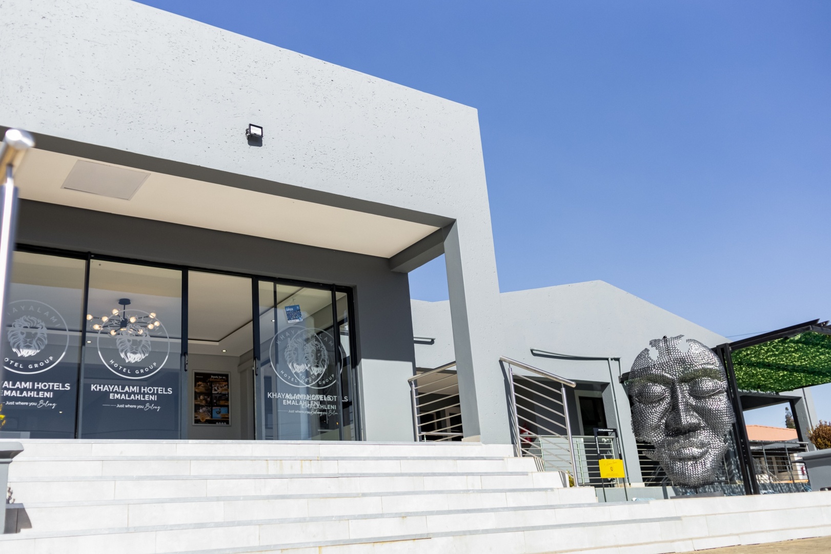 Modern hotel entrance with glass doors, wide white steps, and a large metal face sculpture under a clear blue sky