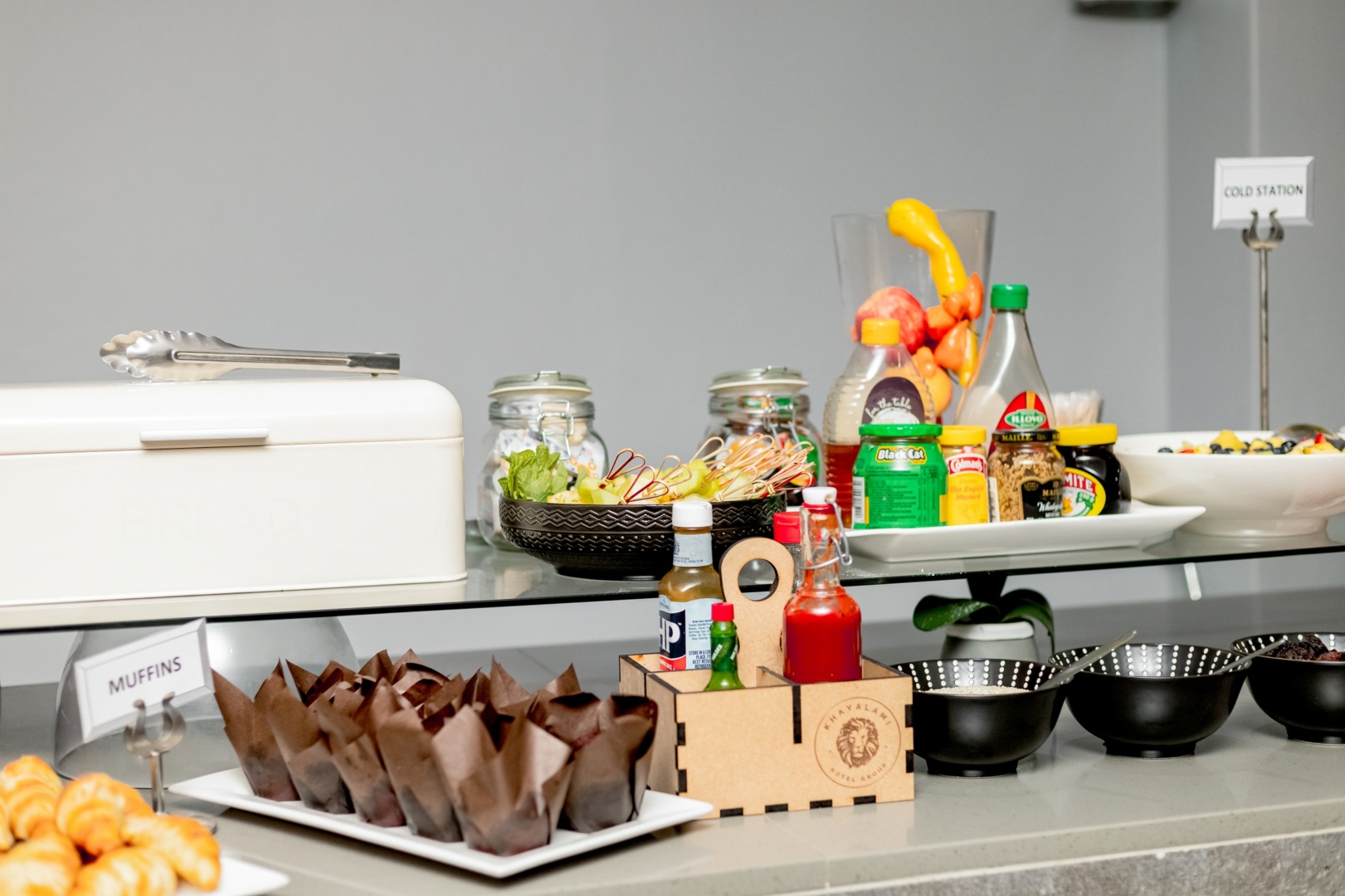 Breakfast buffet with muffins, croissants, fresh fruit skewers, condiments, jams, and salad dressings on a clean counter
