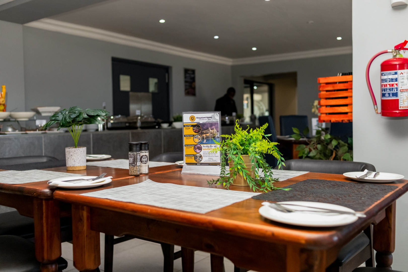 Cozy dining table set with plates, cutlery, salt and pepper shakers, and decorative plants in a modern hotel restaurant.