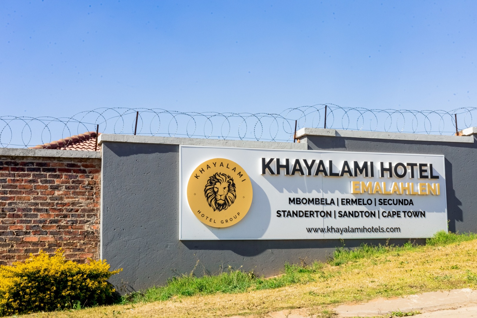 Exterior hotel sign on grey wall with barbed wire showing Khayalami Hotel Emalahleni and locations including Cape Town and Sandton