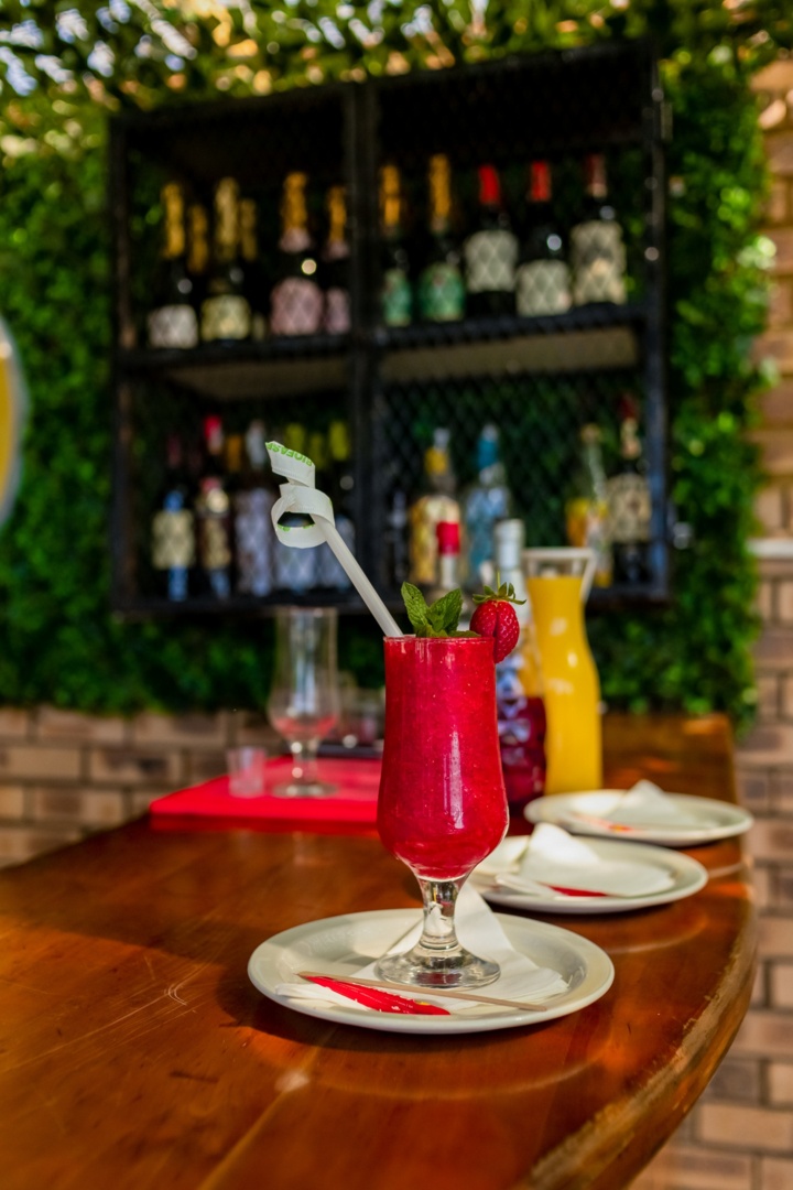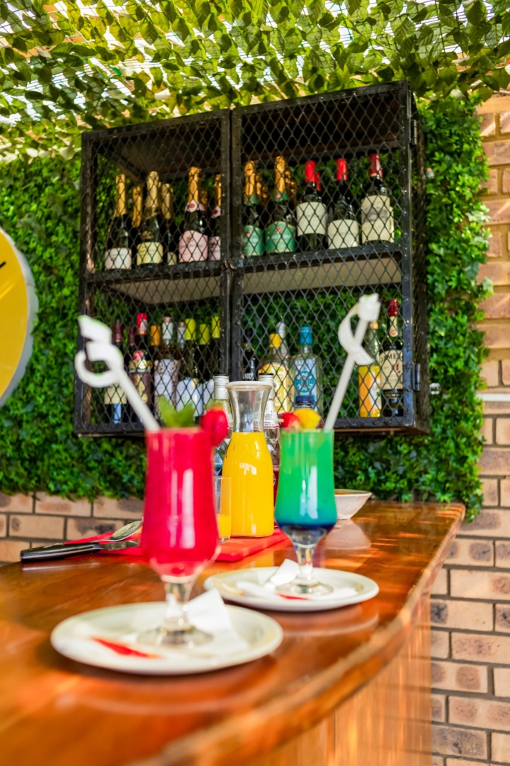 Colorful cocktails and orange juice served on a wooden bar counter with a green ivy wall and wine bottles in a black metal rack