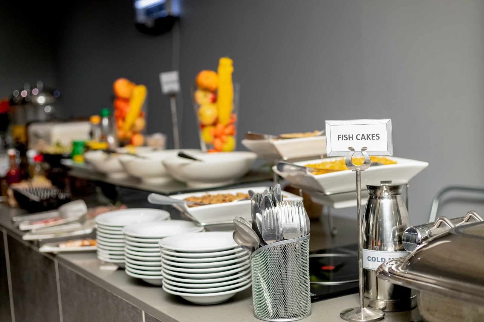Buffet table setup with stacks of white plates, cutlery holder, dishes labeled fish cakes, and various condiments in a modern dining area
