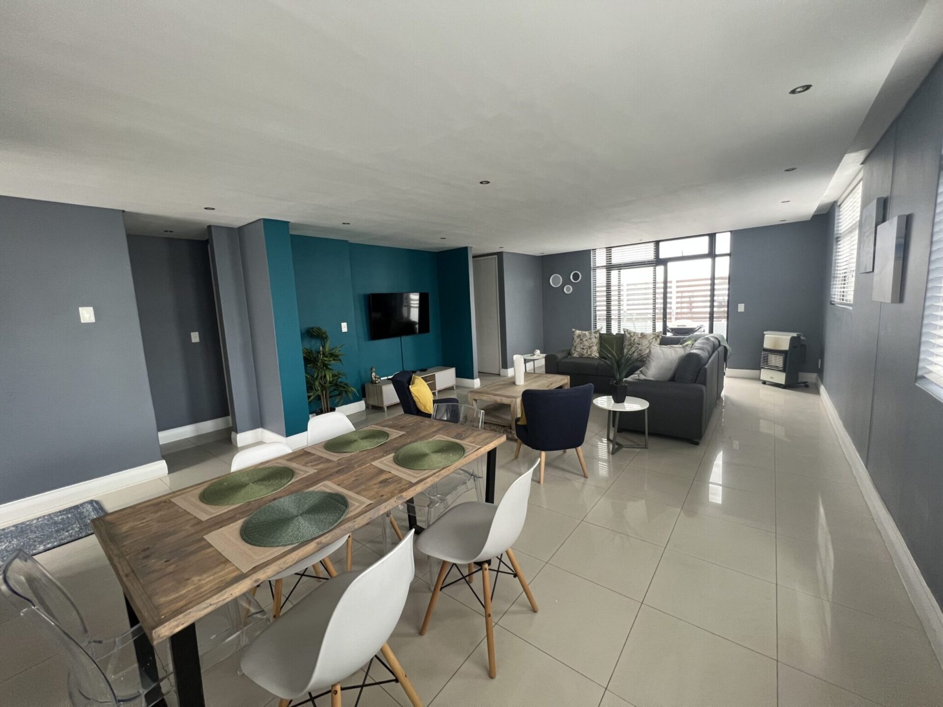 Spacious living and dining area with a wooden table, modern chairs, blue accent wall, flat-screen TV, and cozy seating near large windows