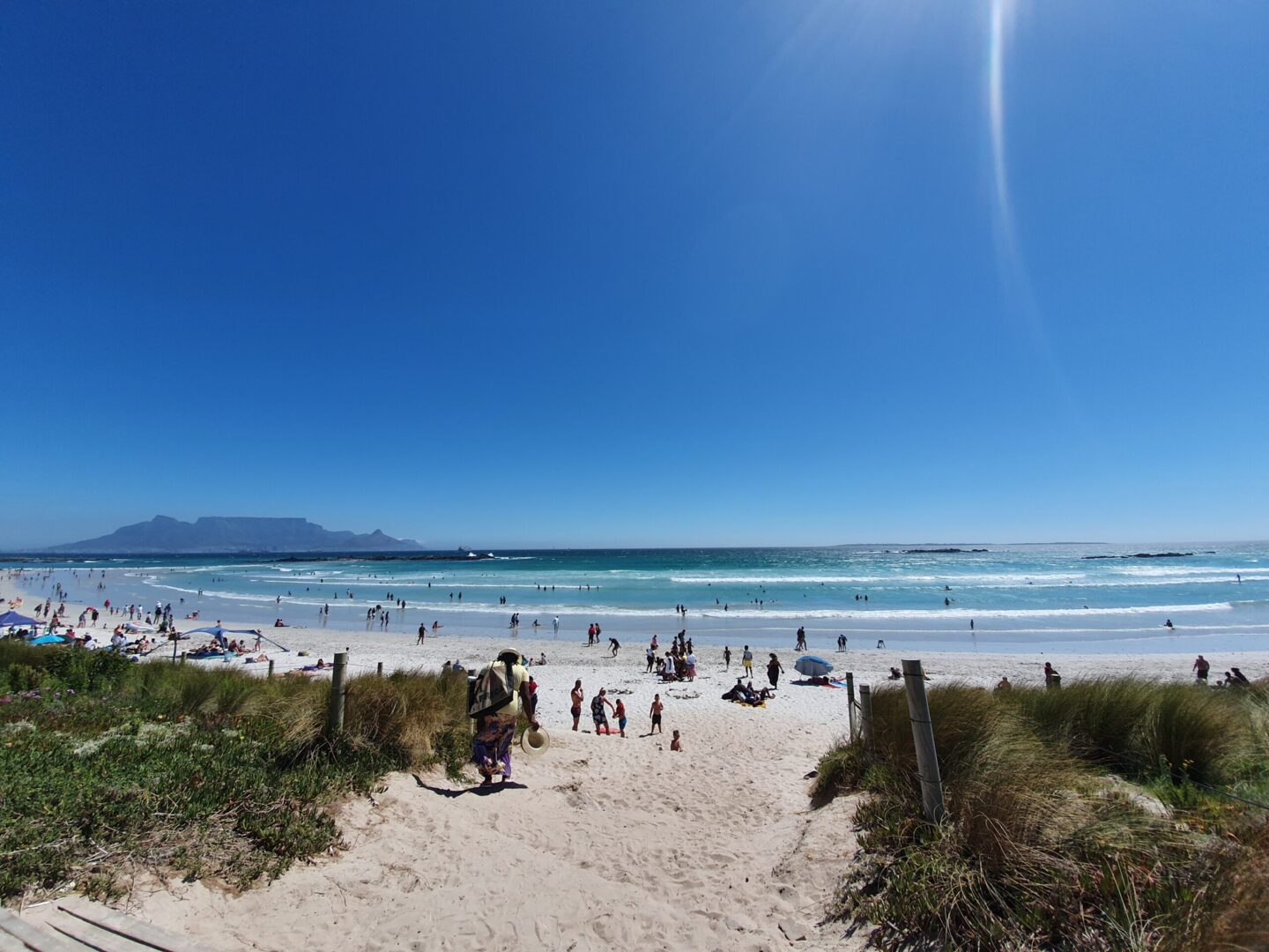 Sunny beach with white sand and people swimming, sunbathing, and playing, with a distant view of a flat-topped mountain under clear blue sky