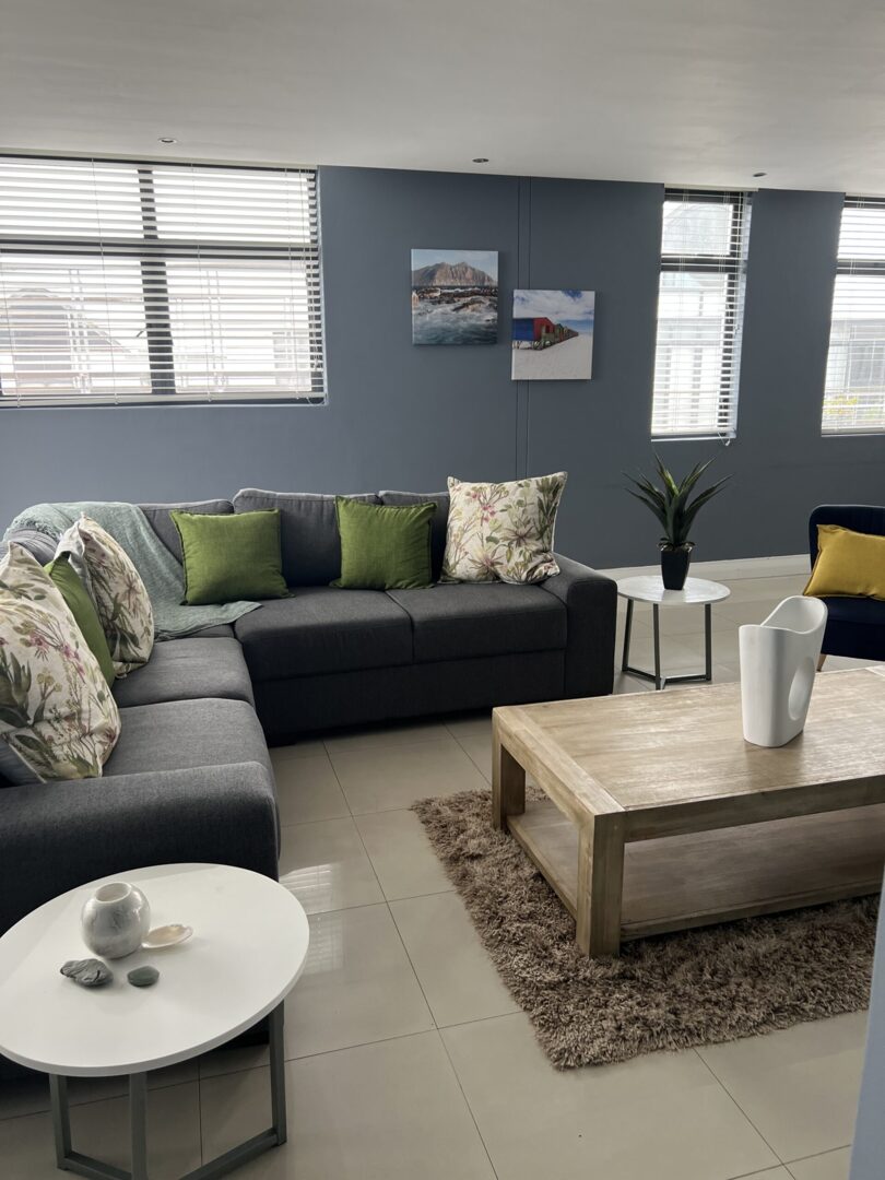 Modern hotel lounge with gray sectional sofa, floral and green pillows, wood coffee table on shag rug, and natural light from large windows
