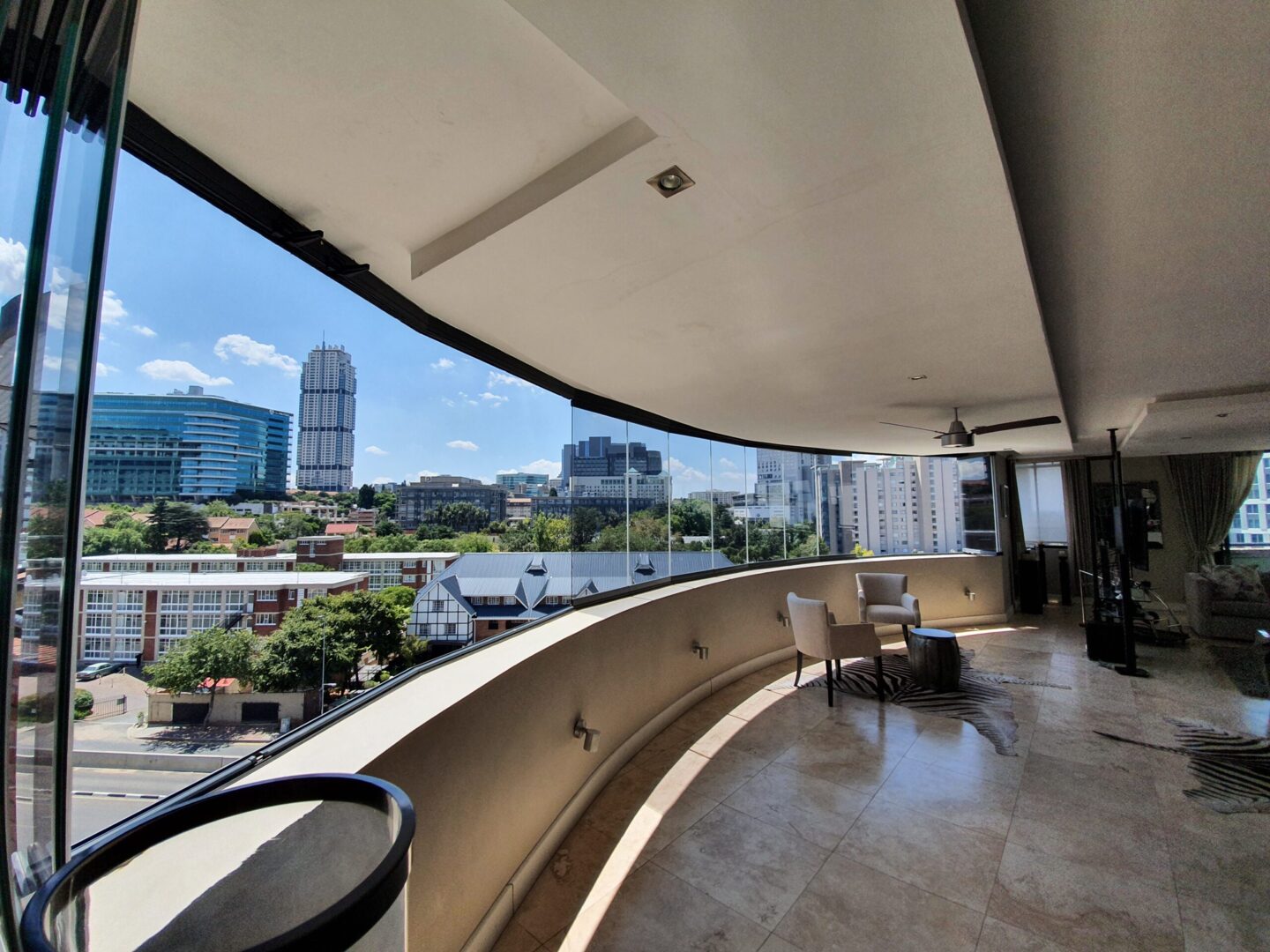 Spacious hotel balcony with curved glass railing offering panoramic city skyline views and two armchairs for relaxation