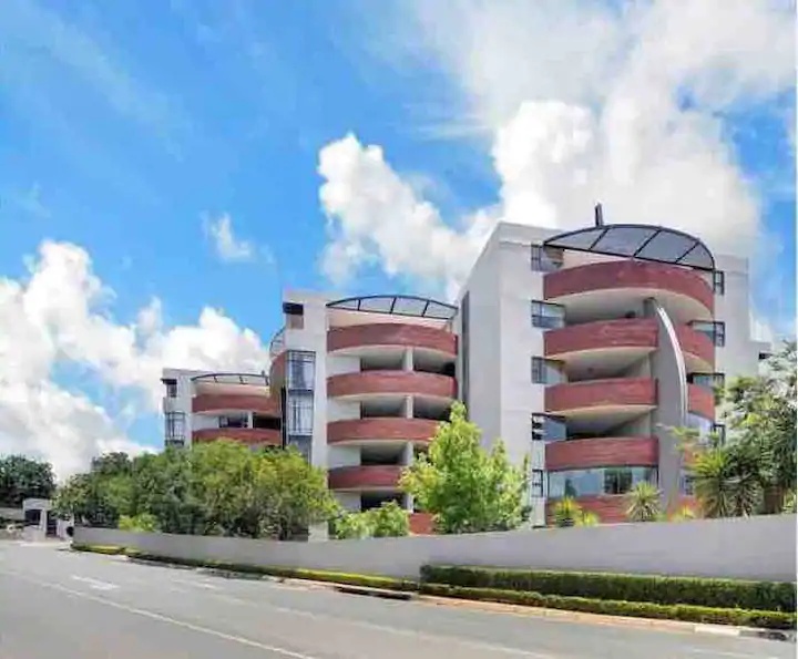 Modern hotel exterior with gray buildings, balconies, and signage for Secunda by Khayalami Hotel Group under a clear blue sky