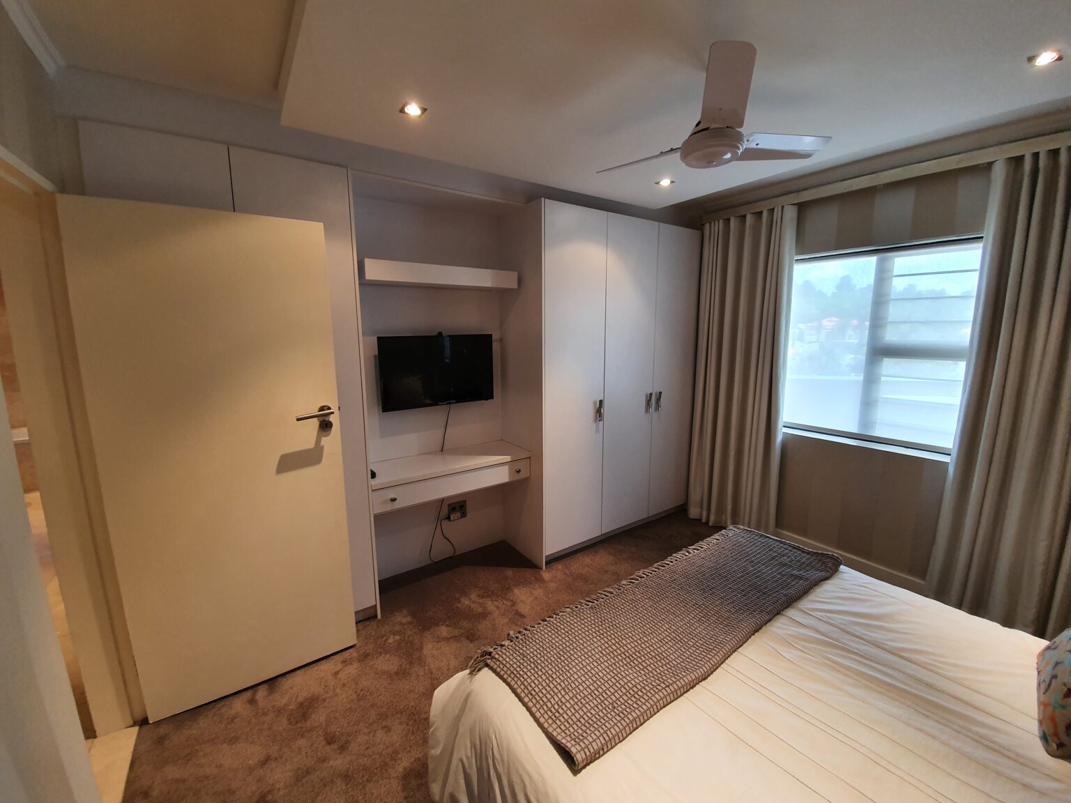 Cozy hotel bedroom with a double bed, textured throw, built-in white wardrobes, wall-mounted TV, ceiling fan, and a window with beige curtains