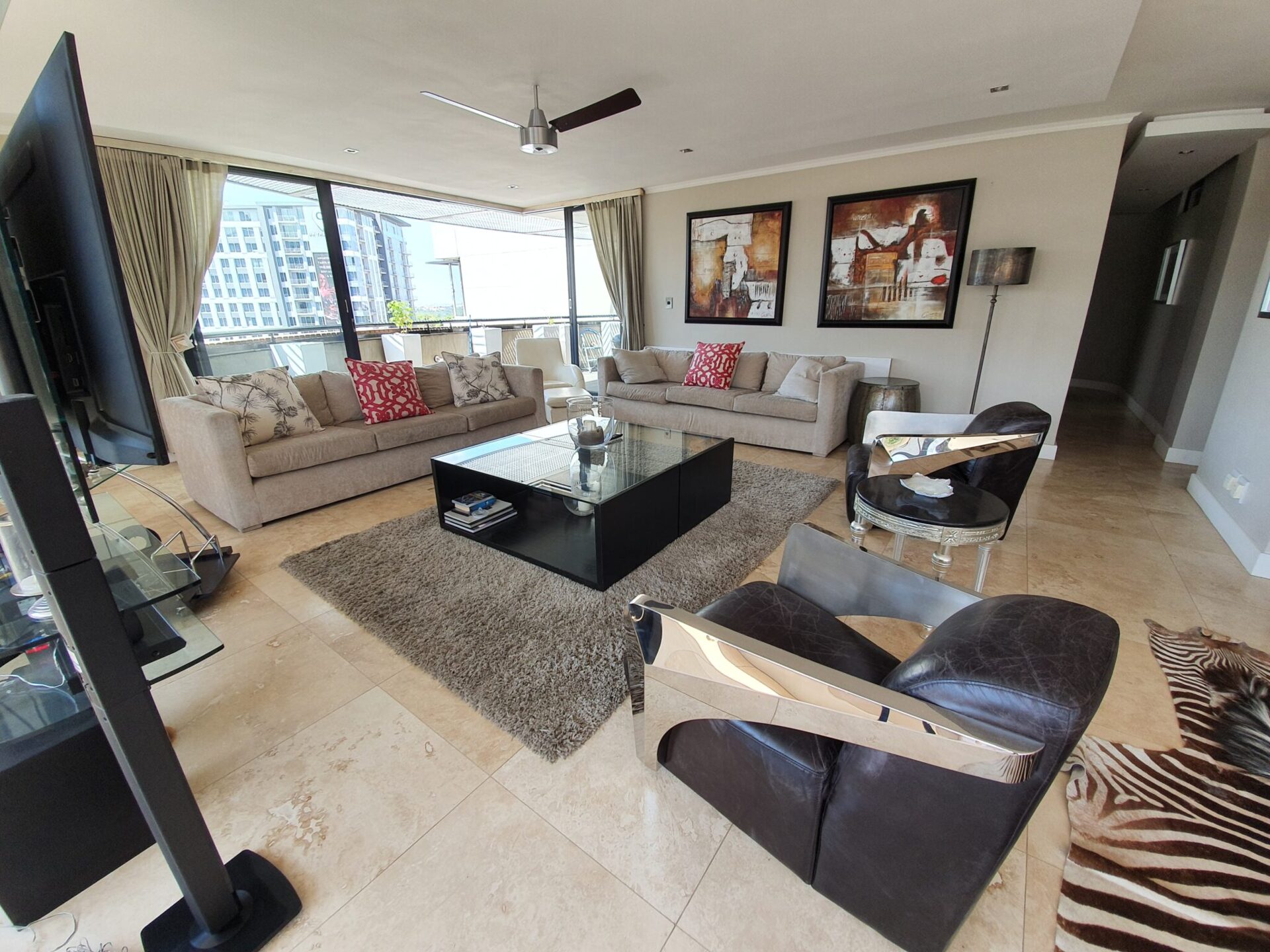 Modern hotel suite living area with beige sofas, red accent pillows, black leather chairs, glass coffee table, and balcony with city view