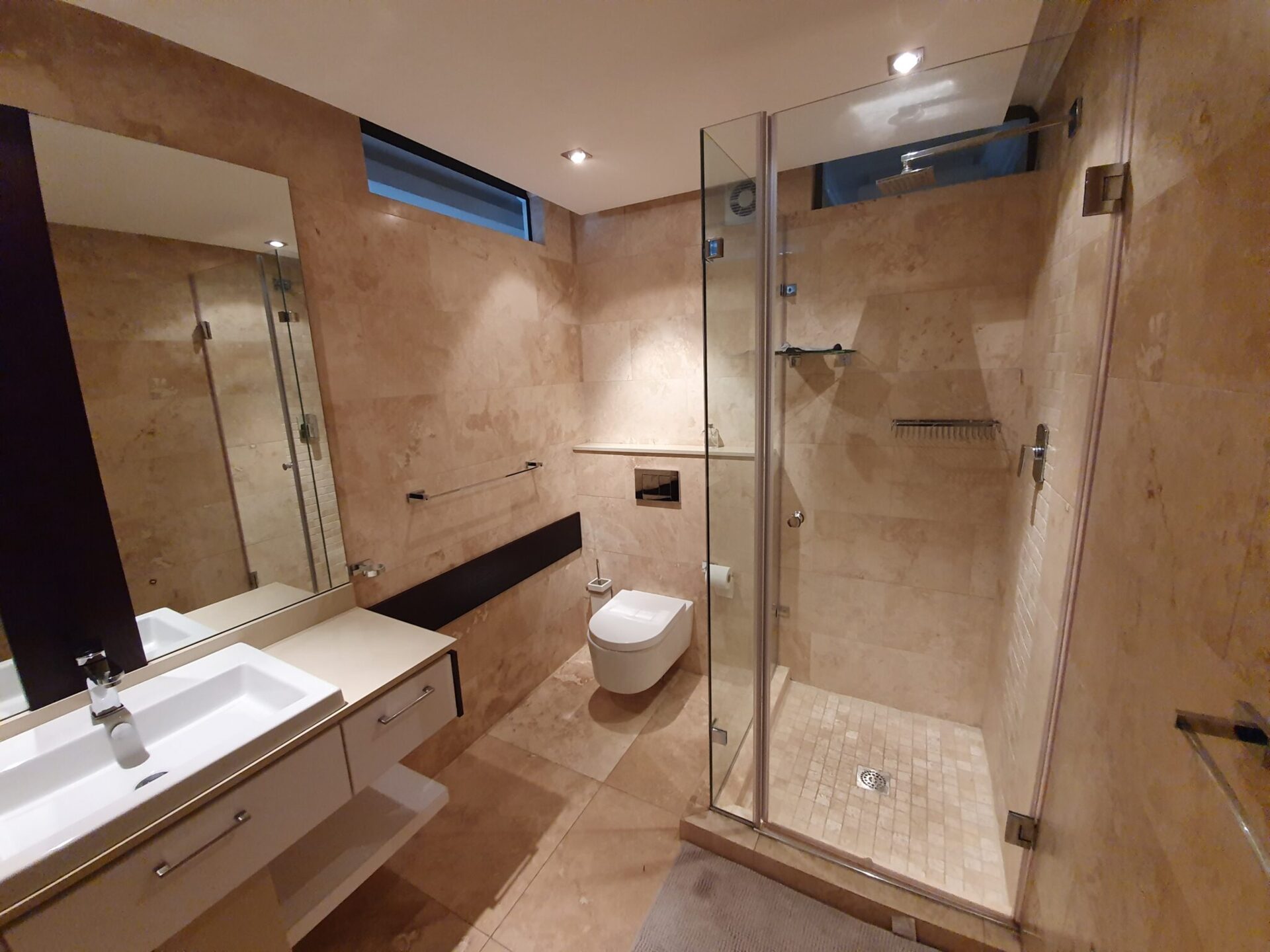 Modern hotel bathroom with beige stone tiles, glass-enclosed shower, wall-mounted toilet, and sleek white sink vanity