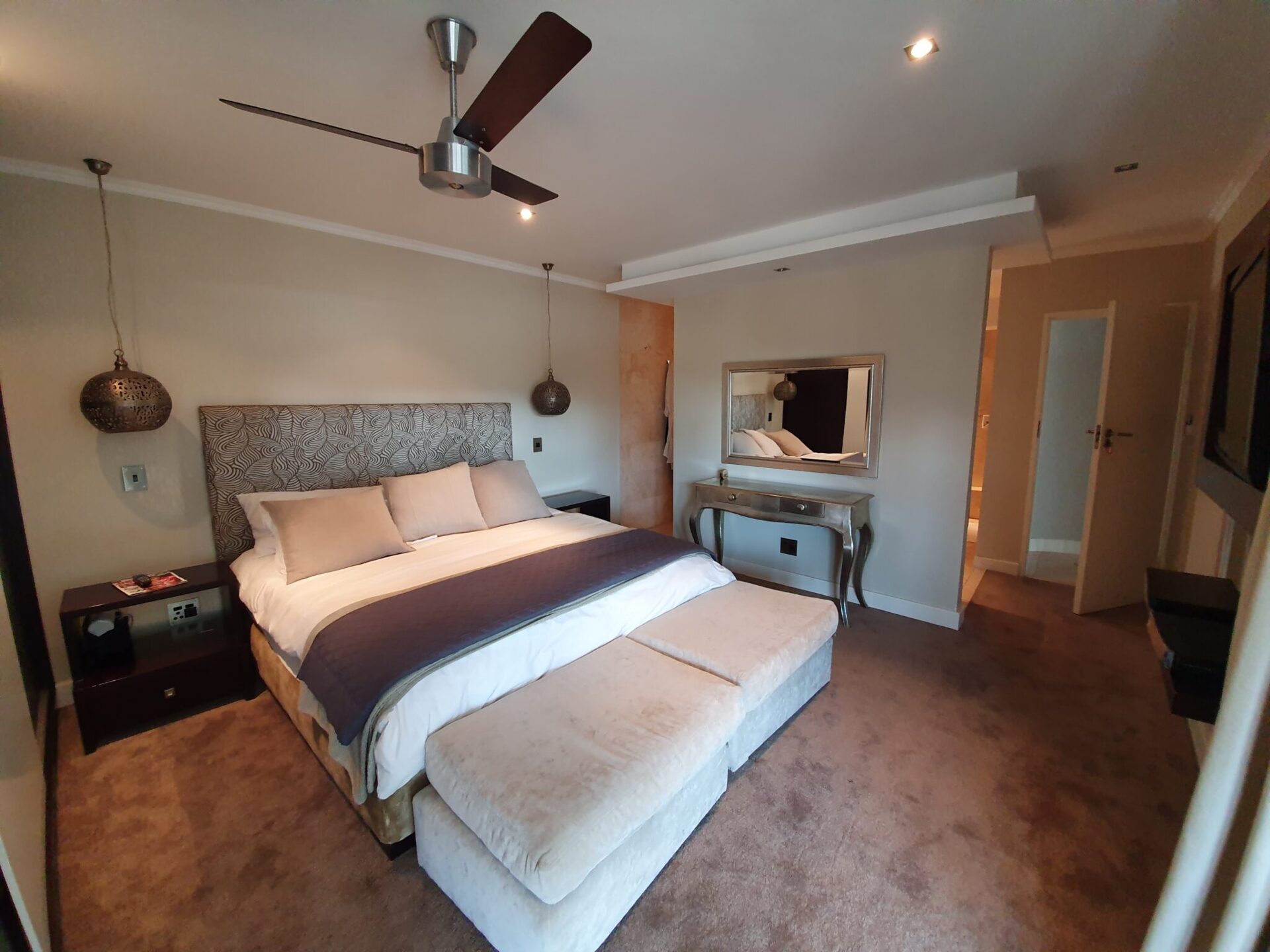 Cozy hotel bedroom with king bed, patterned headboard, hanging bedside lamps, bench seating, wall mirror, and neutral-toned decor