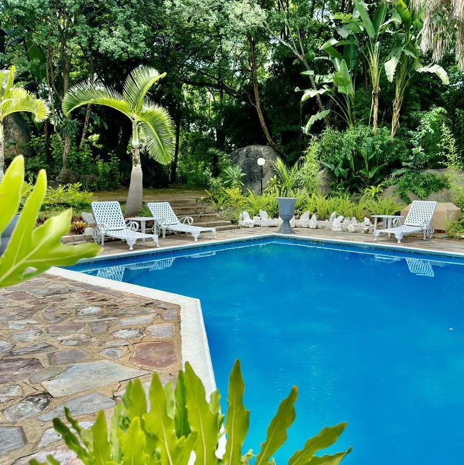 Outdoor swimming pool surrounded by tropical greenery and palm trees with white lounge chairs on stone patio