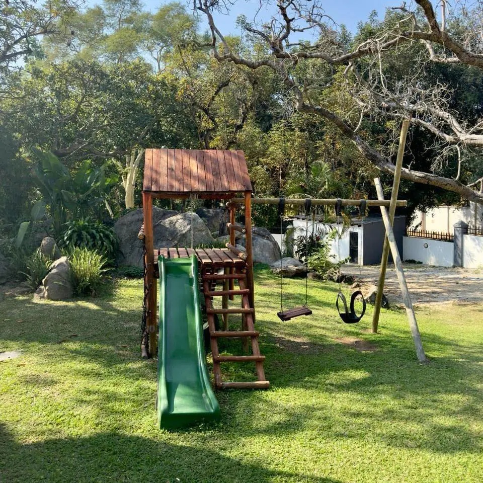Outdoor wooden playground with green slide and swings set on lush green lawn surrounded by trees, ideal for family-friendly hotel guests