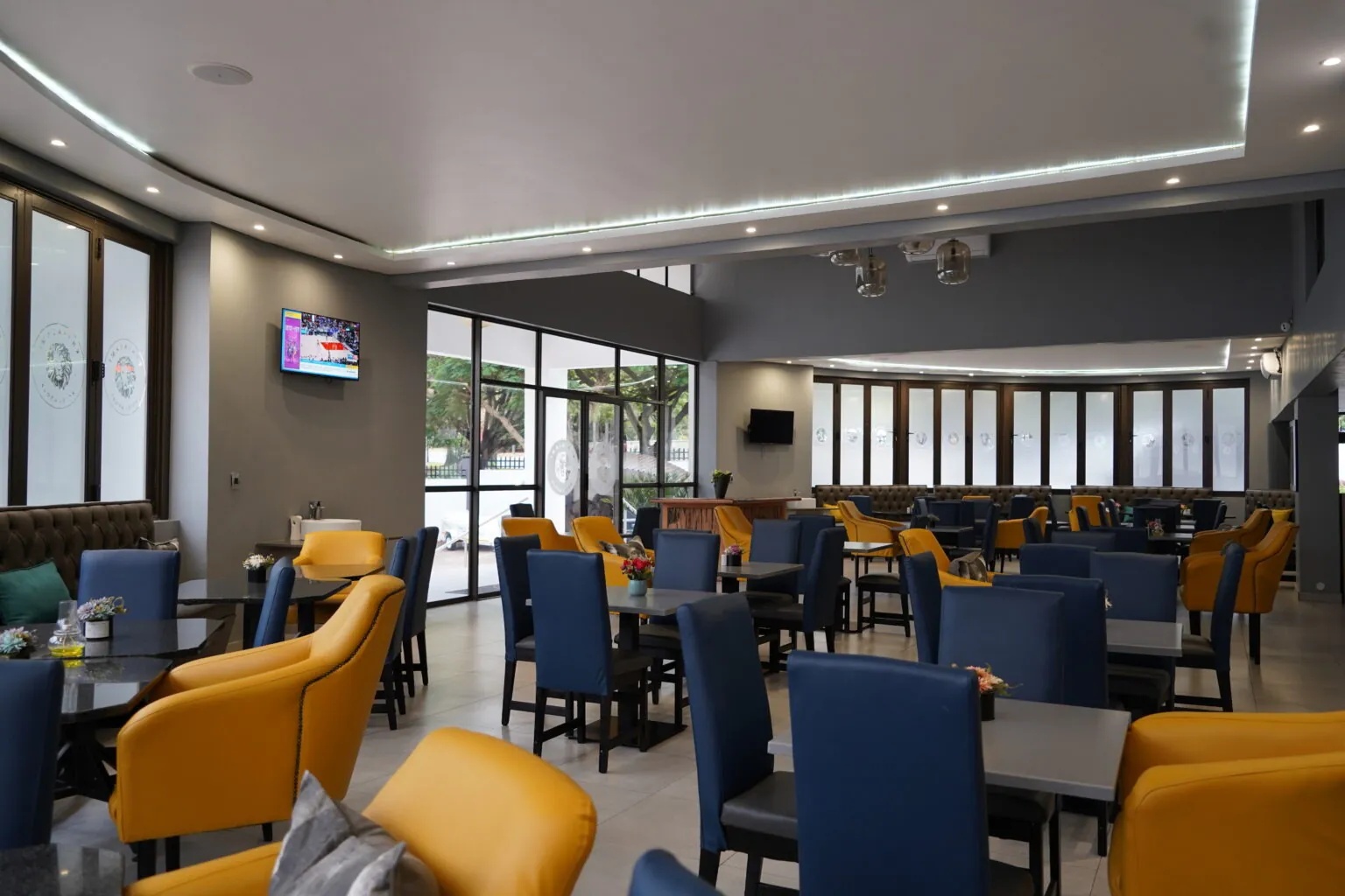 Modern hotel dining area with yellow and blue upholstered chairs, black tables, large windows, and ambient ceiling lighting