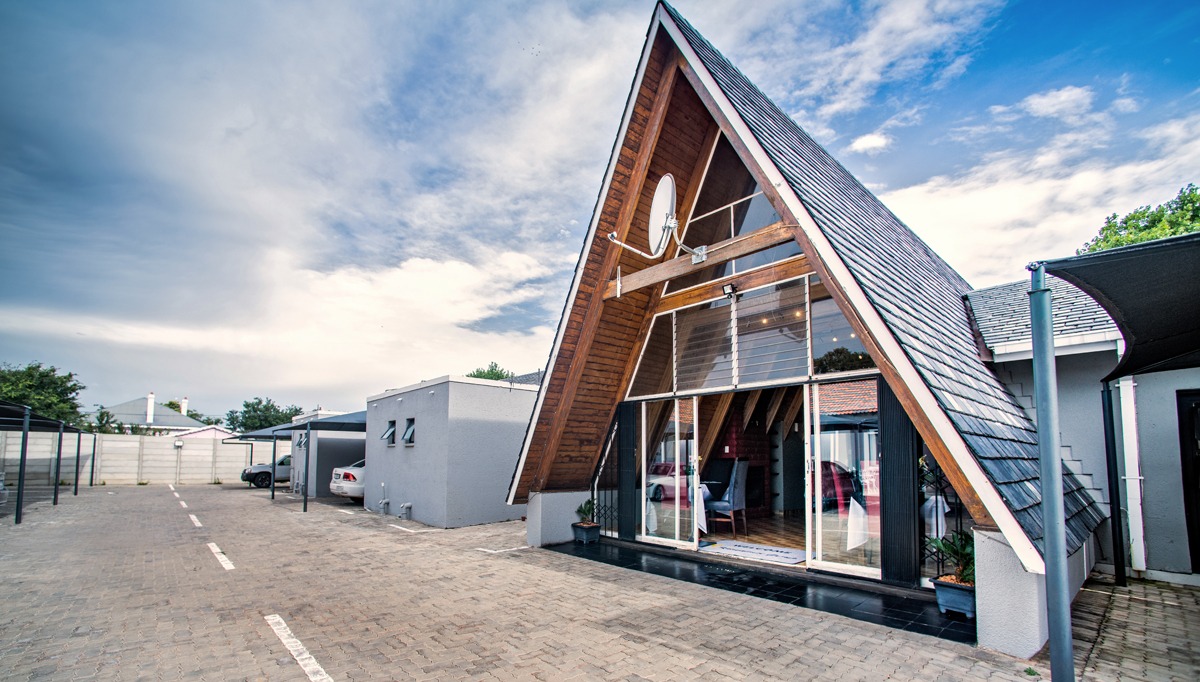 Modern A-frame guesthouse with large glass sliding doors, wooden interior accents, and covered parking spaces on a paved lot