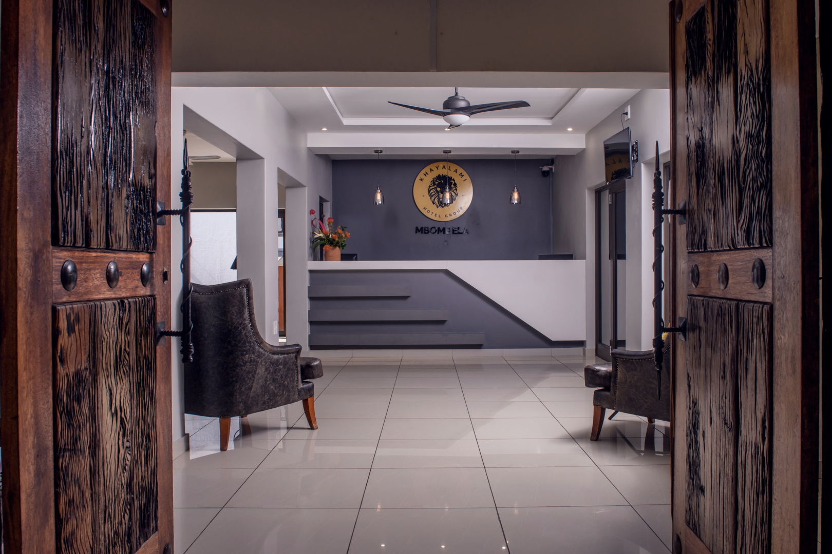 Reception area with a modern white desk, gray accent wall, pendant lights, dark armchairs, and rustic wooden doors open
